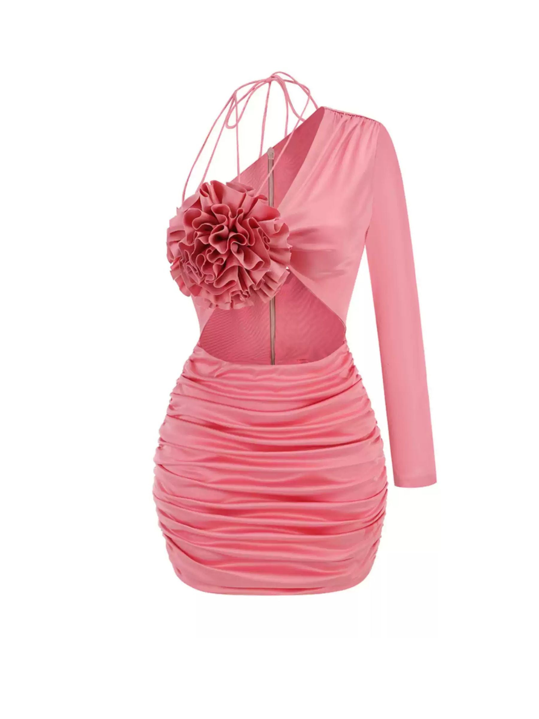 Turn heads with the Abella Floral One Shoulder Dress in Pink. a bold choice for your next event. Featuring an intricate floral design and daring cut-out detailing. this dress is all about confidence. The asymmetrical neckline and ruched skirt highlight your silhouette. while the single long sleeve adds an edgy touch. Crafted from high-quality fabric. it offers both comfort and a figure-flattering fit.