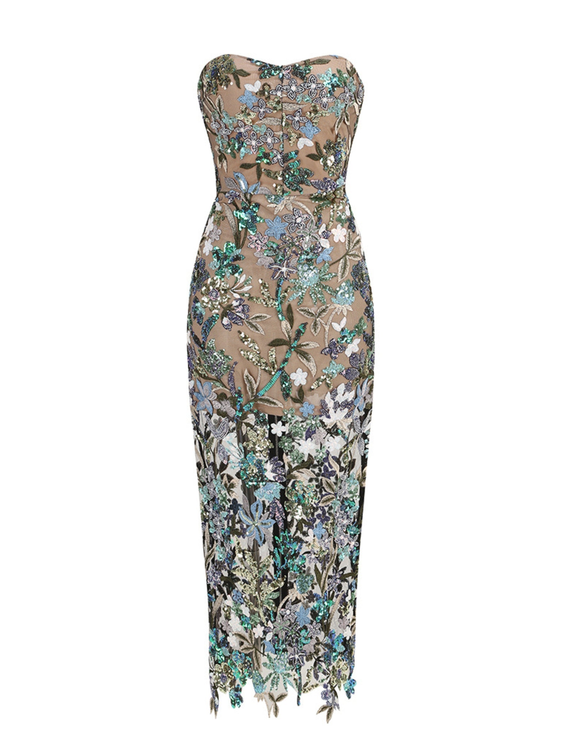 Get ready to turn heads in the Aidan Embroidered Maxi Dress! This strapless dress features a heart neckline and high waist for a slim fit that will make you feel classy and elegant. With floral and sequin embroidery. you'll be sure to stand out at any party or cocktail event. Plus. the slightly see-through fabric adds a touch of intrigue to your look. From the Aesvs Party & Cocktail Collection.