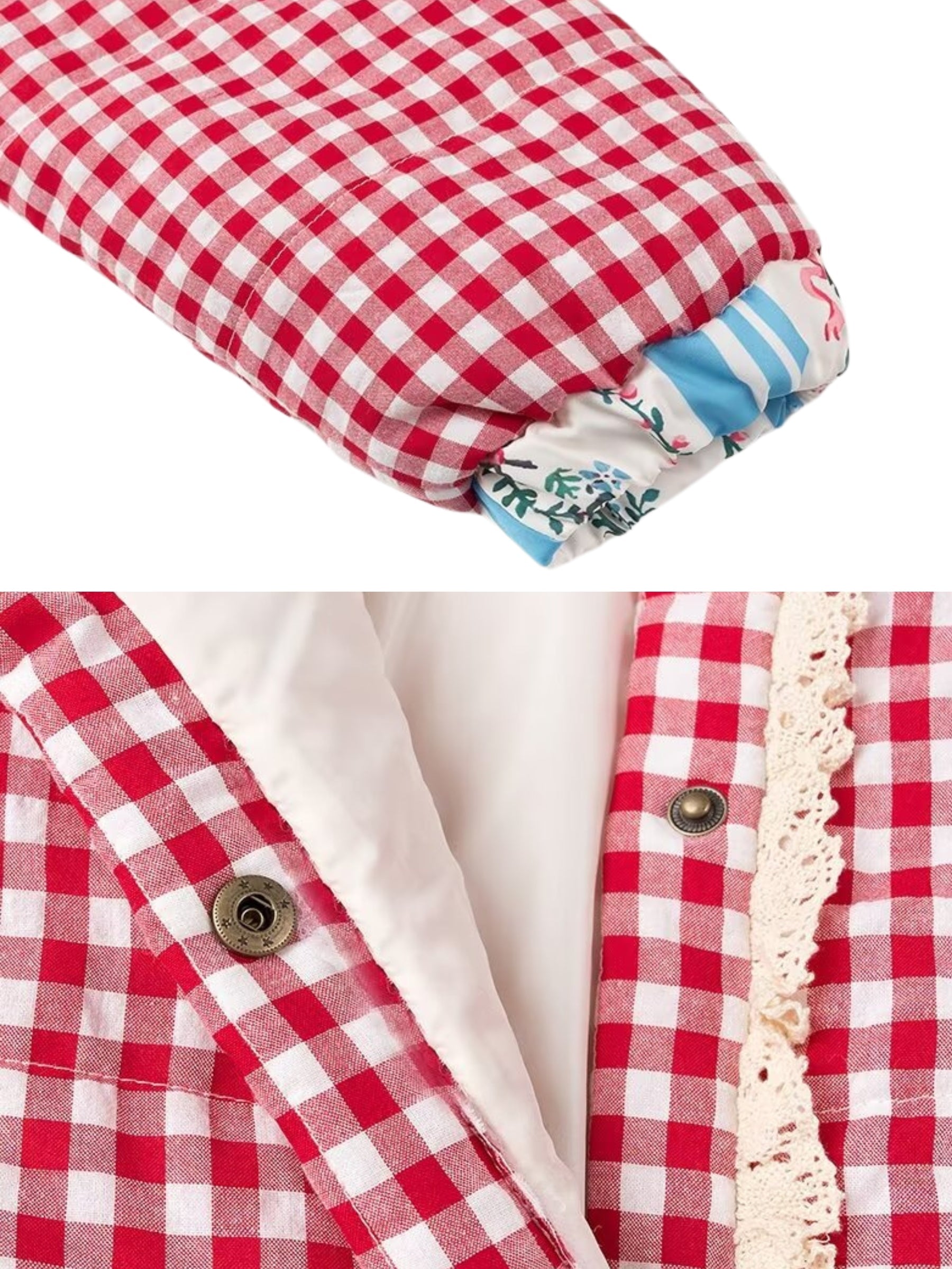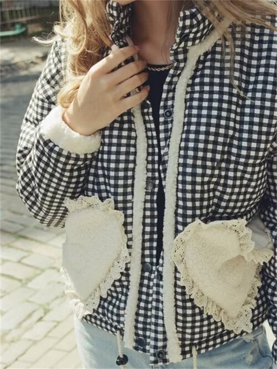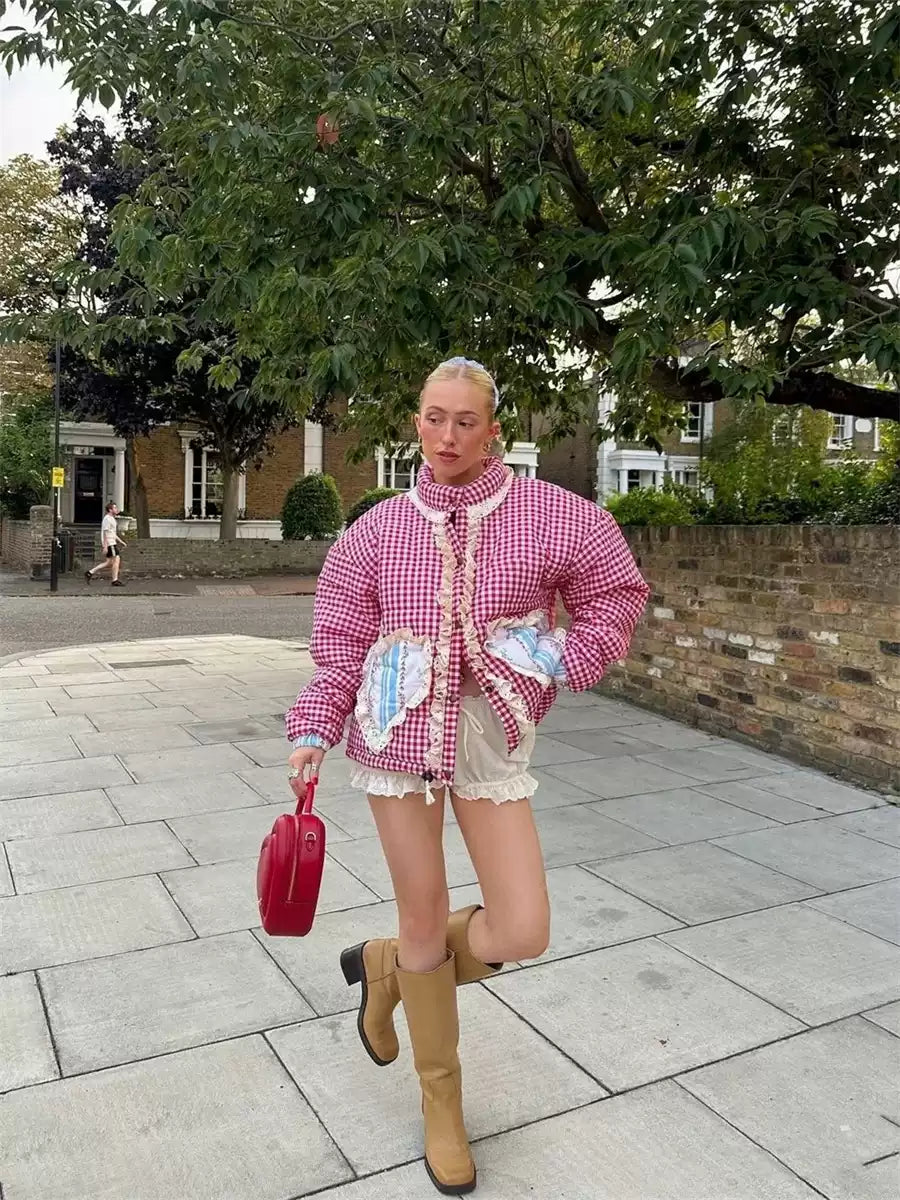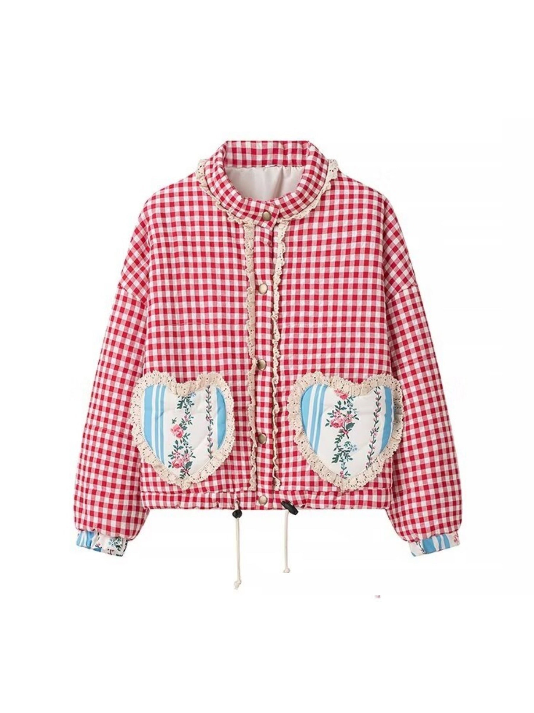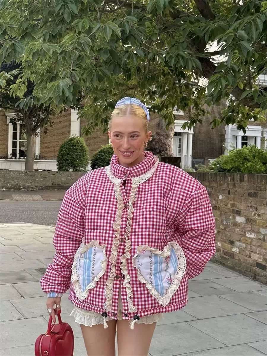 Step into a playful aesthetic with the Amabel Gingham Heart Patch Jacket. This cozy jacket features a classic gingham print. accented by whimsical heart patches on the front pockets. Perfect for layering. the jacket offers a relaxed fit with an adjustable drawstring hem and elastic cuffs for added comfort. Ideal for casual outings or adding a statement to your everyday look.