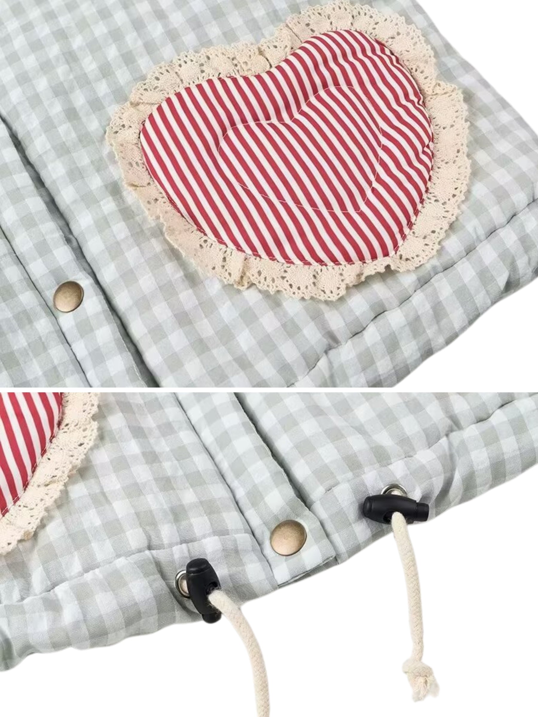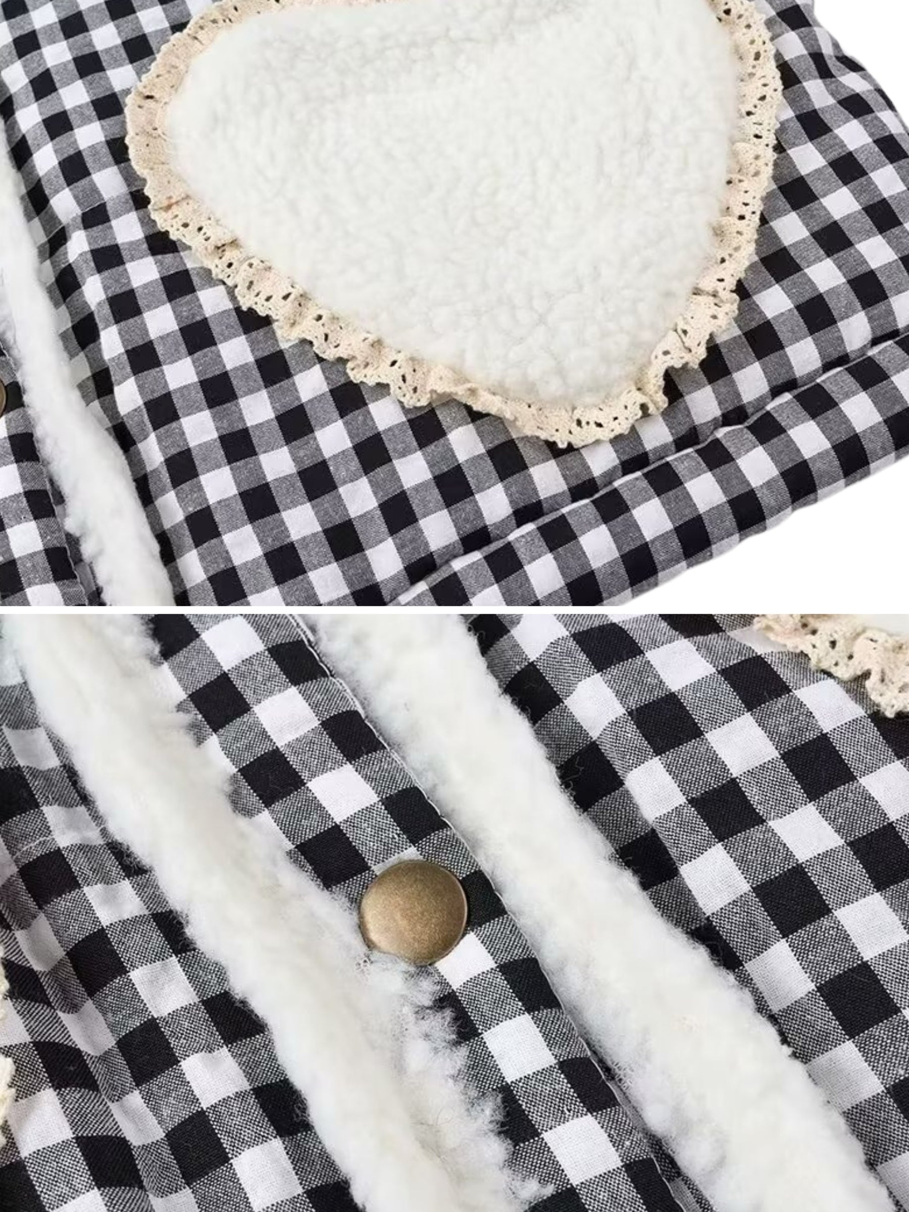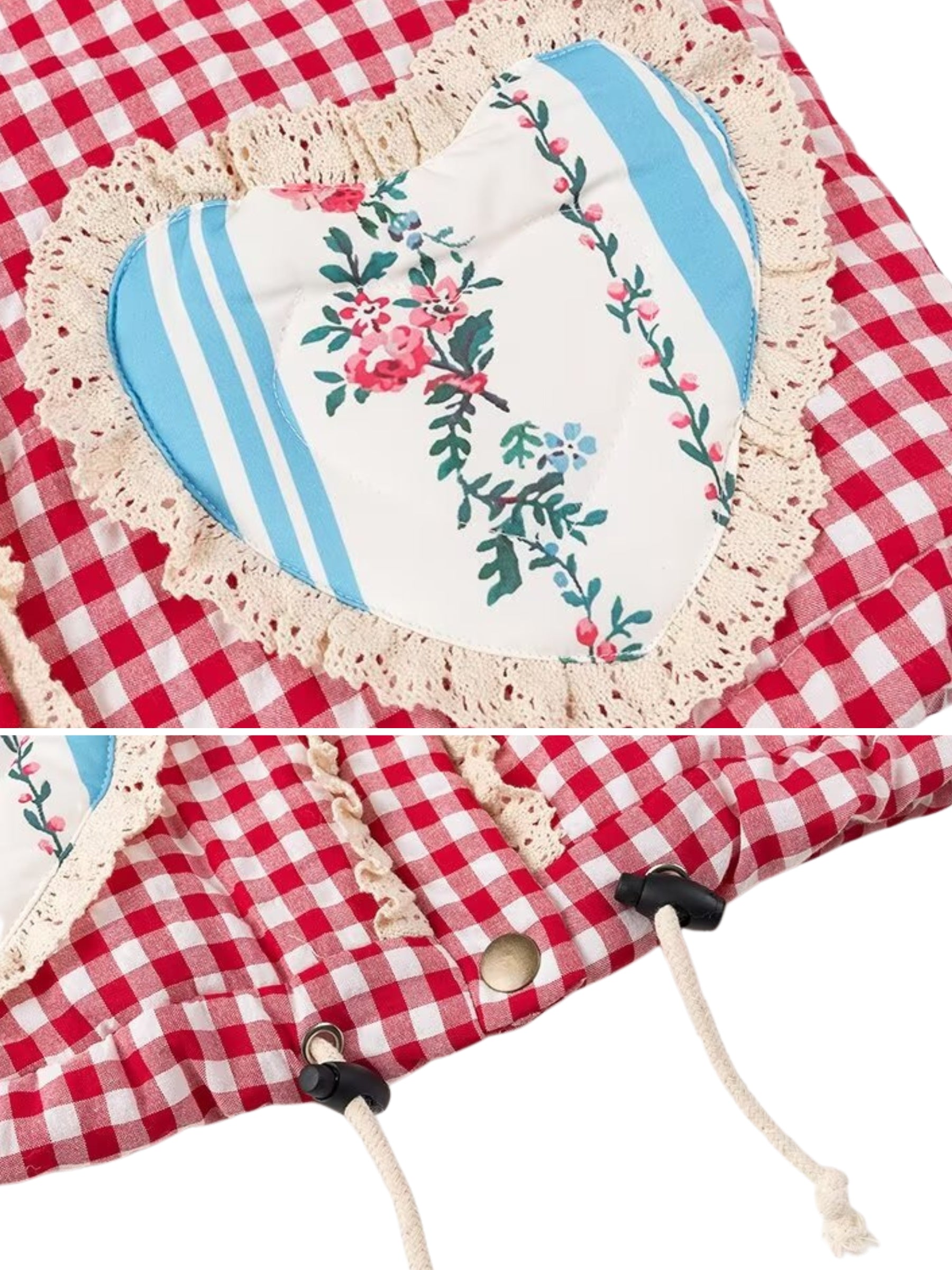 • Classic gingham print with heart-shaped front patches