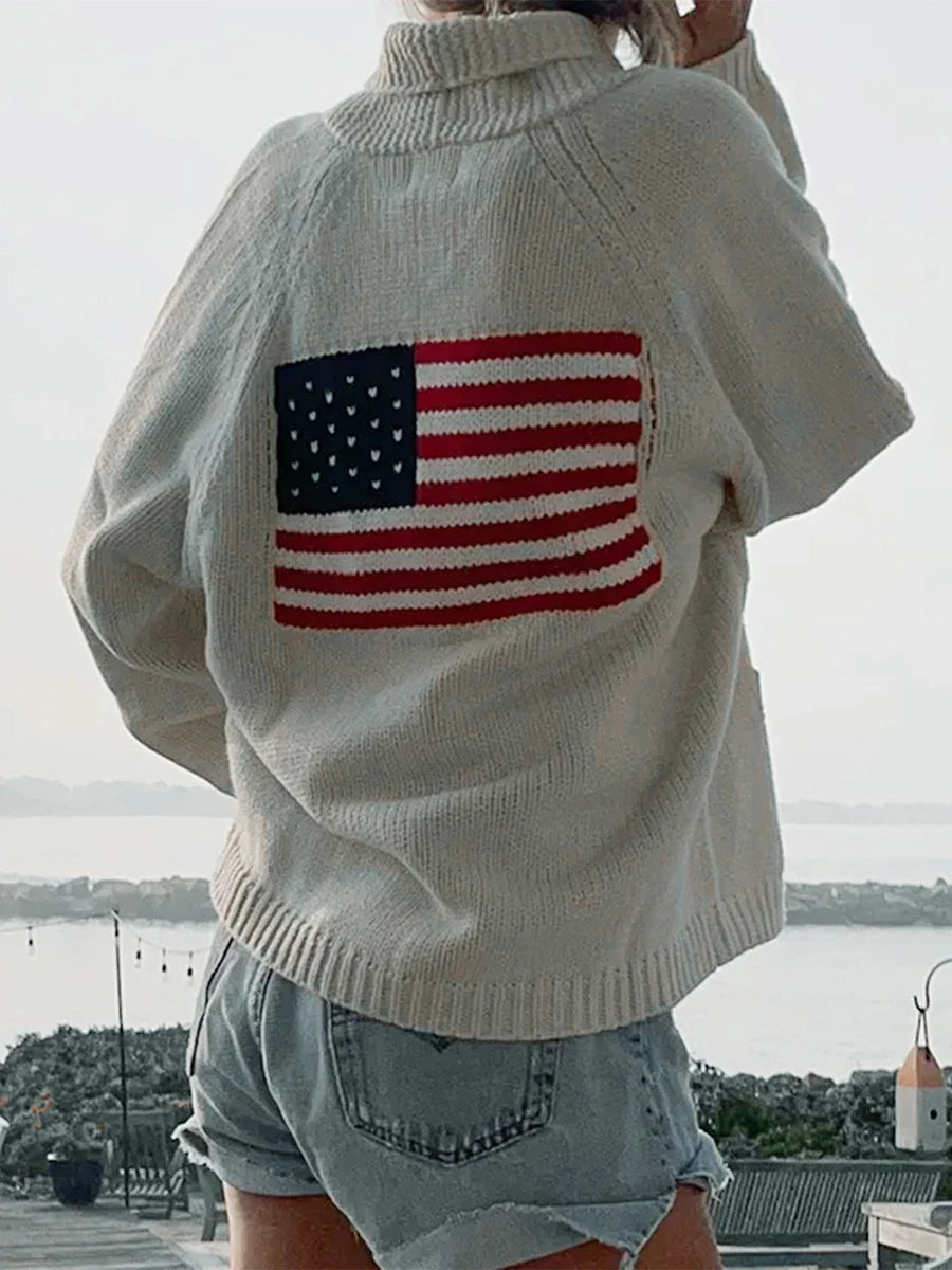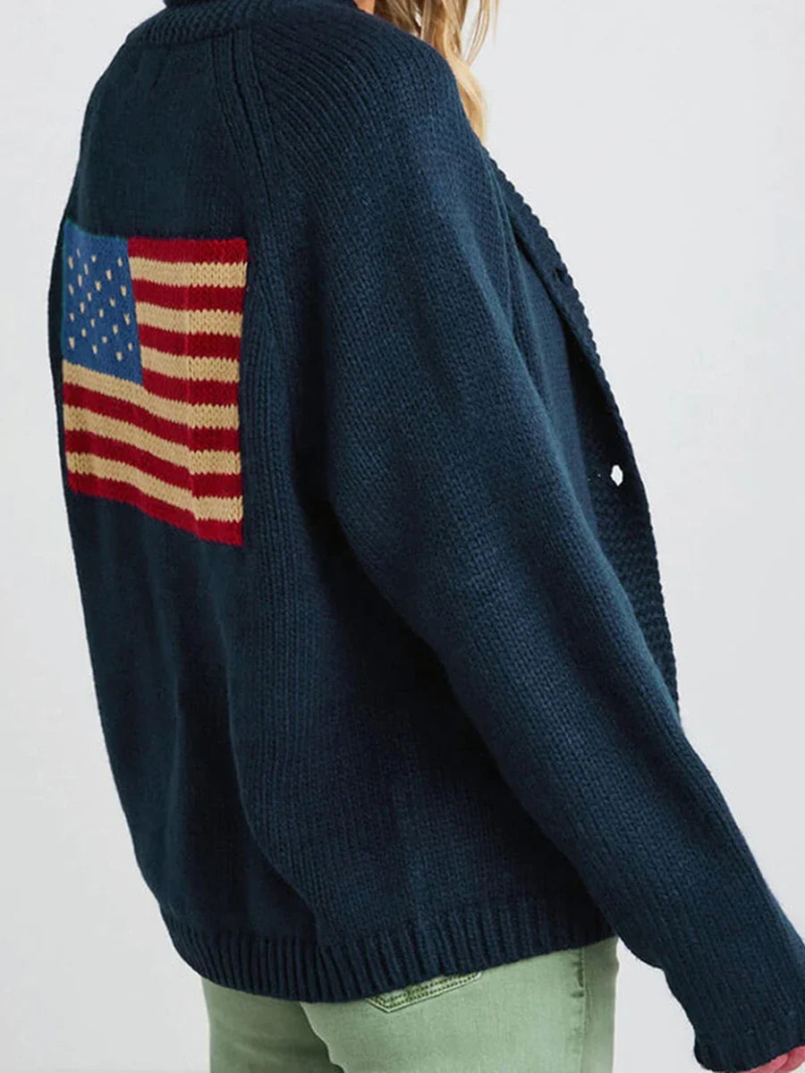 Show your patriotic style with our American Flag Cardigan. a comfortable and chic addition for any adult wardrobe. This cozy piece features a striking American flag print. making it a perfect statement for holidays or everyday wear. Designed with an open stitch closure and a flattering v-neck collar. it offers effortless layering.
