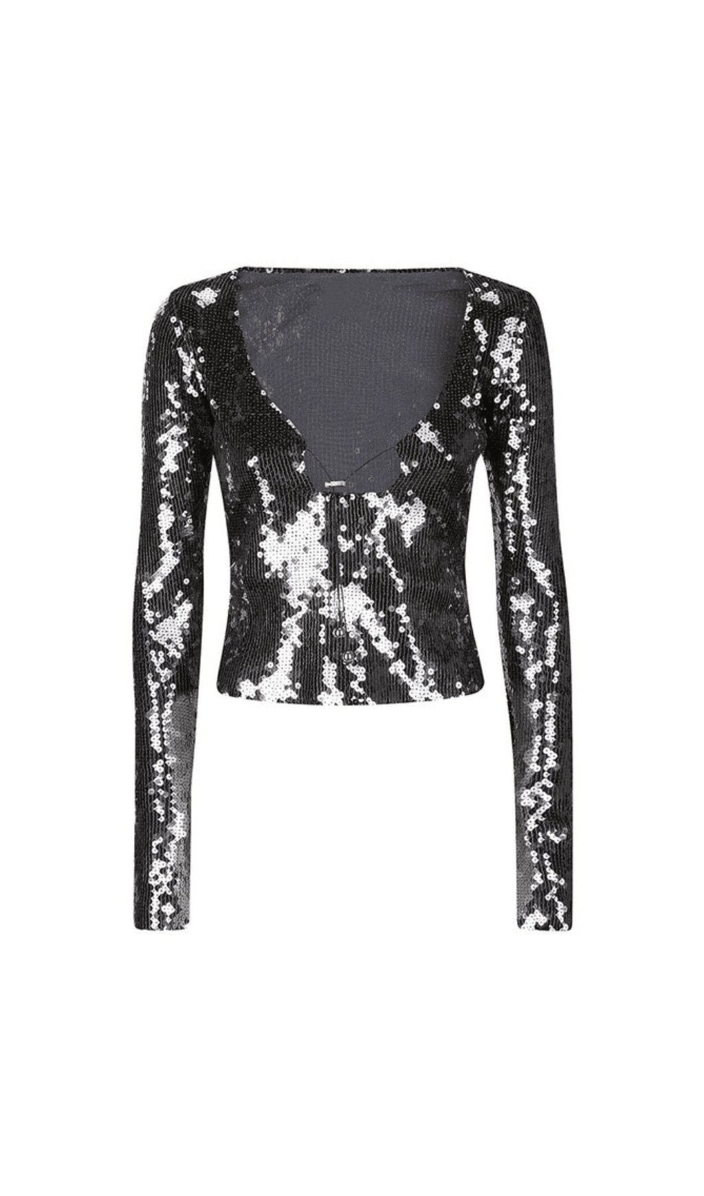 The top is made of a stretchy and comfortable fabric called tulle. and it's covered in small sequins that reflect the light beautifully. The anthracite color is a mix of dark grey and black. which adds to the sophisticated and elegant look of the top. It features a fitted silhouette. long sleeves. and a crew neckline that creates a sleek and modern vibe. The top can be paired with a variety of bottoms. such as skinny jeans. leather pants. or a midi skirt. to create a chic and fashionable outfit for a night out or a special event.