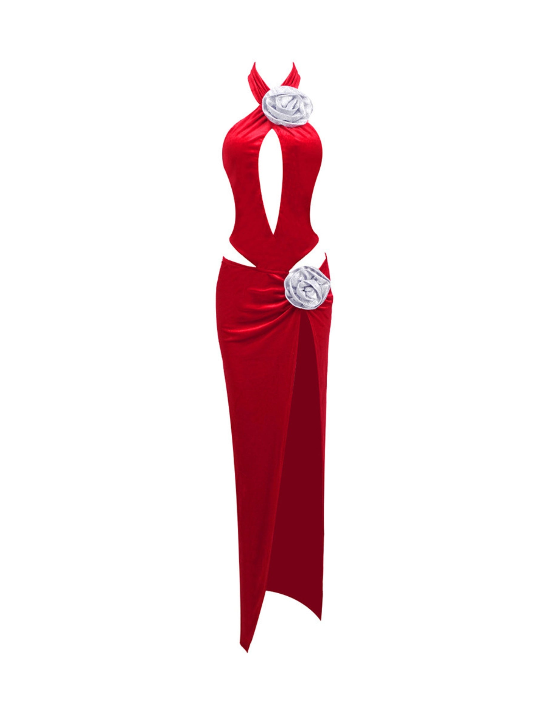 Turn heads with the Arisa Cut-Out Velvet Maxi Dress. This bold and daring design showcases a halter neck and cut-out details. perfect for making a statement. The luxurious red velvet fabric hugs your curves. while the rose embellishments at the waist and bust add an elegant touch. With a thigh-high slit. this dress is ideal for your next special event. leaving a lasting impression.