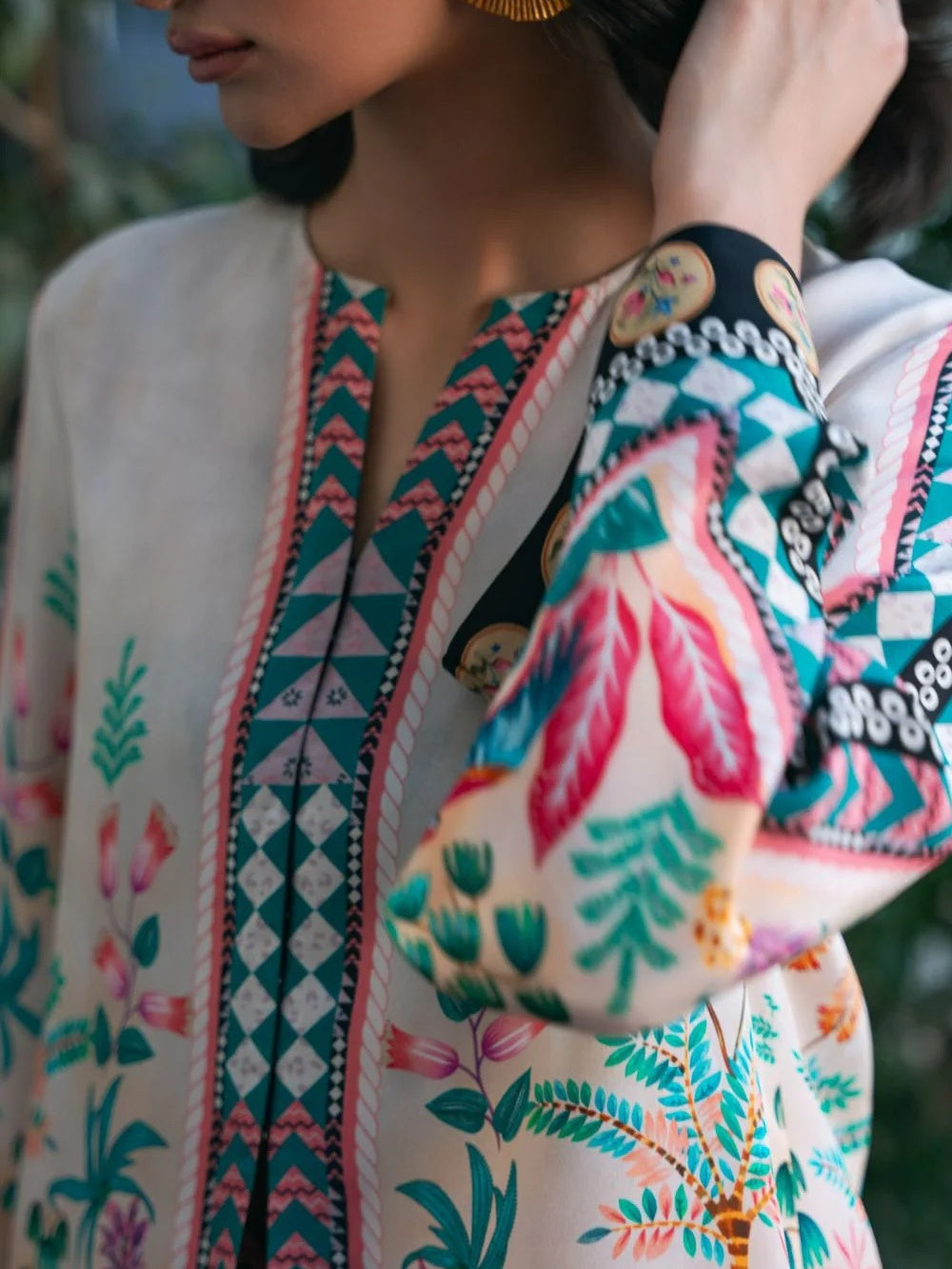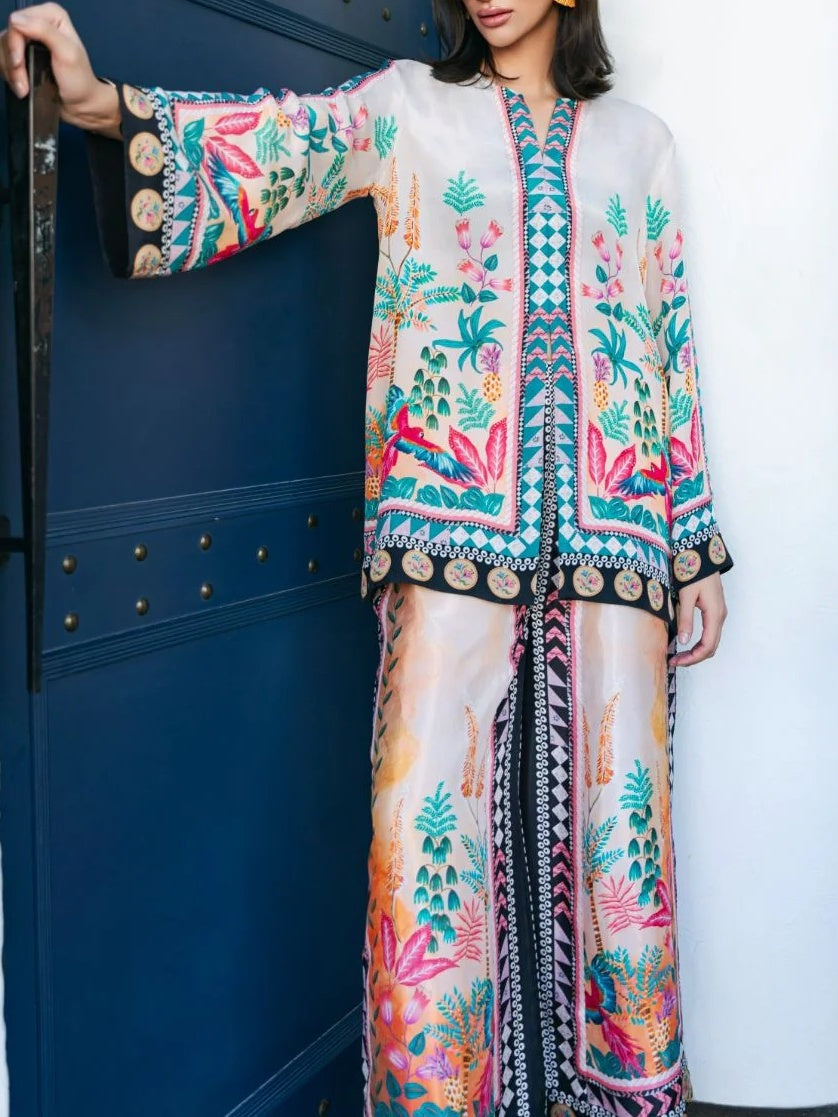 This co - ord set is a tropical paradise brought to fashion. Crafted from smooth silk. the top features vibrant palm and floral prints framed by intricate borders. The matching pants echo the artistic design. creating a cohesive. eye - catching look. Perfect for vacations or adding a touch of exotic charm to daily wear. it combines comfort and bold style effortlessly.