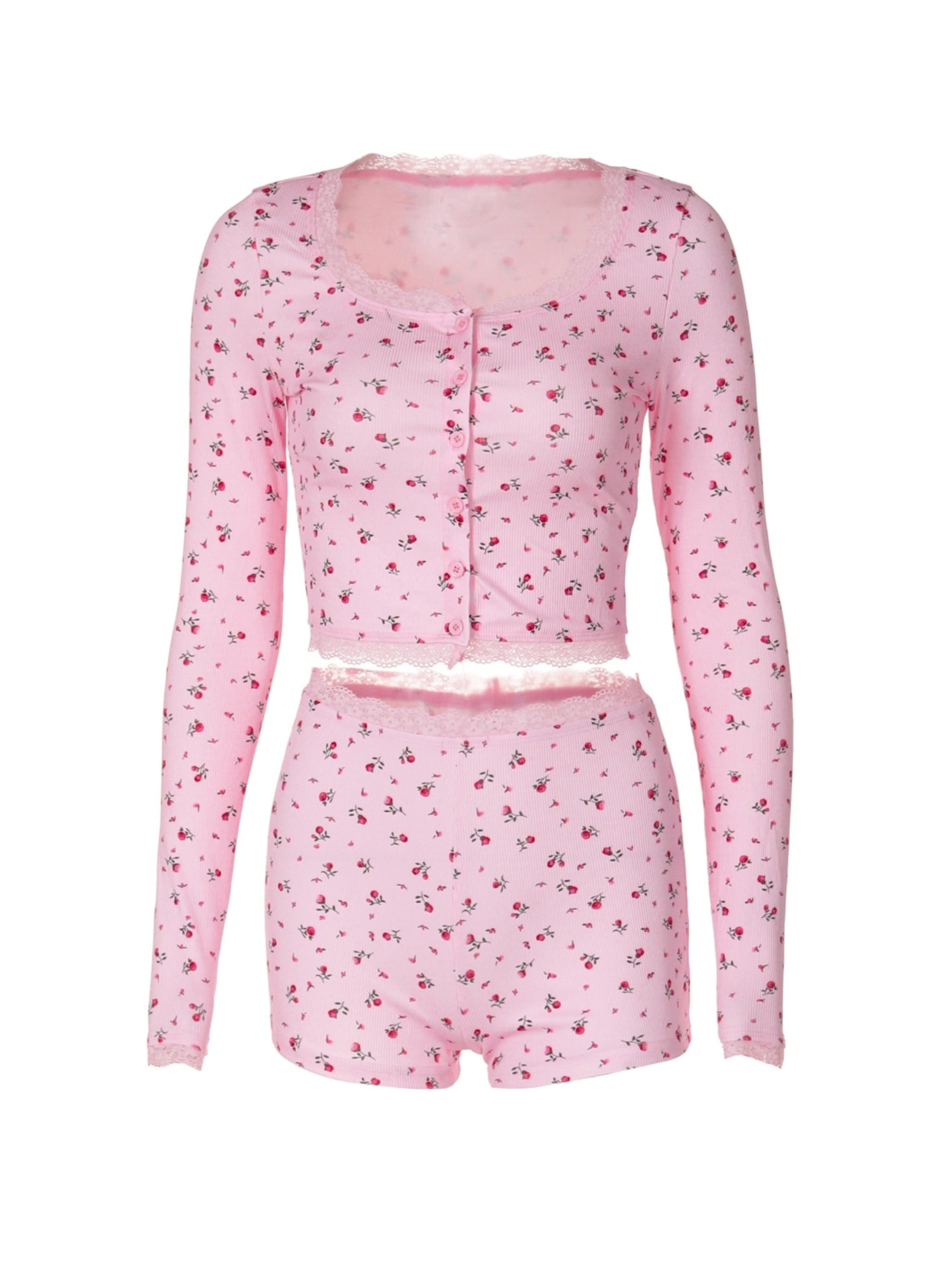 Unleash your inner good girl with our Aster Casual Shorts Set! This playful set features a long sleeve top and shorts. both adorned with floral prints and delicate lace details. Its slim fit and button-up design add a touch of sophistication. Available in pretty pink and crisp white. from our Aesvs Loungewear Collection.