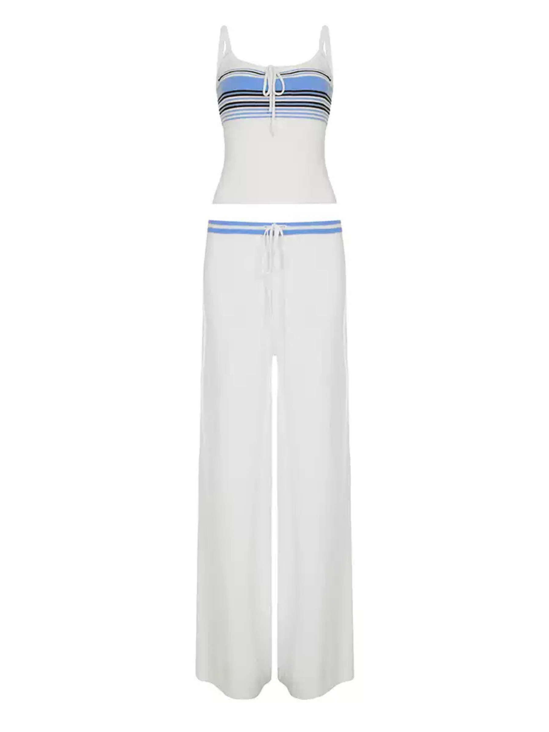 Unleash your sporty side with the Aubrey Knit Two-Piece Set! This set features a cropped tank and wide-leg pants made from soft ribbed knit fabric for ultimate comfort. The adjustable drawstring detail at the bust and elastic waistband with drawstring create a customizable and flattering fit. With subtle blue and white striped details. this set is perfect for casual outings or lounging in style. Part of the Aesvs Sets Collection.