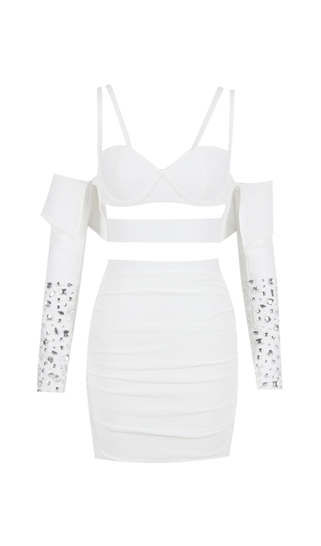 BANDAGE BRIGHT DIAMOND HOLLOW TWO PIECE HALTER WRAP DRESS IN WHITE