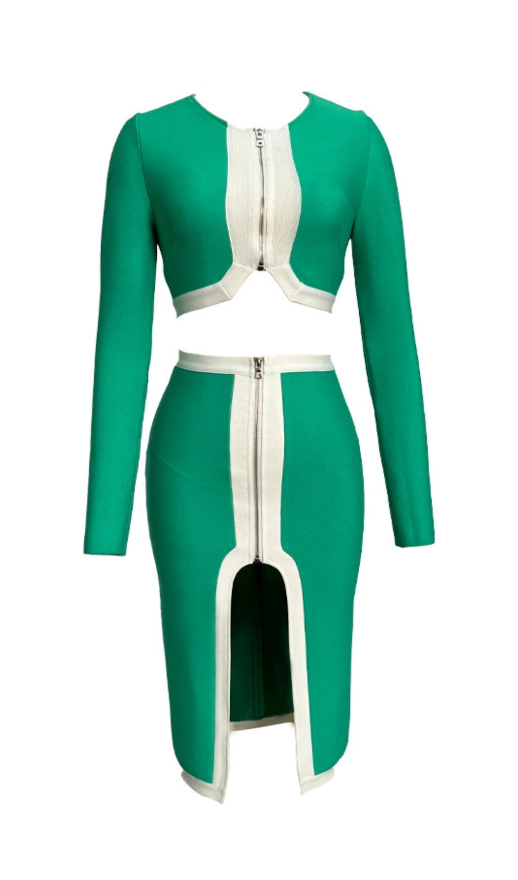 At the same time. the overall look incorporates line elements: white accents on the edges of the garment. adding a lively and playful sense of line. Green is also a neutral colour that accentuates a woman's unique flavour and provides a certain finishing touch. The high waist of the wrap-around skirt accentuates the curves of the legs without being too bulky. and the white lines of the stitching make the whole outfit more harmonious and natural.