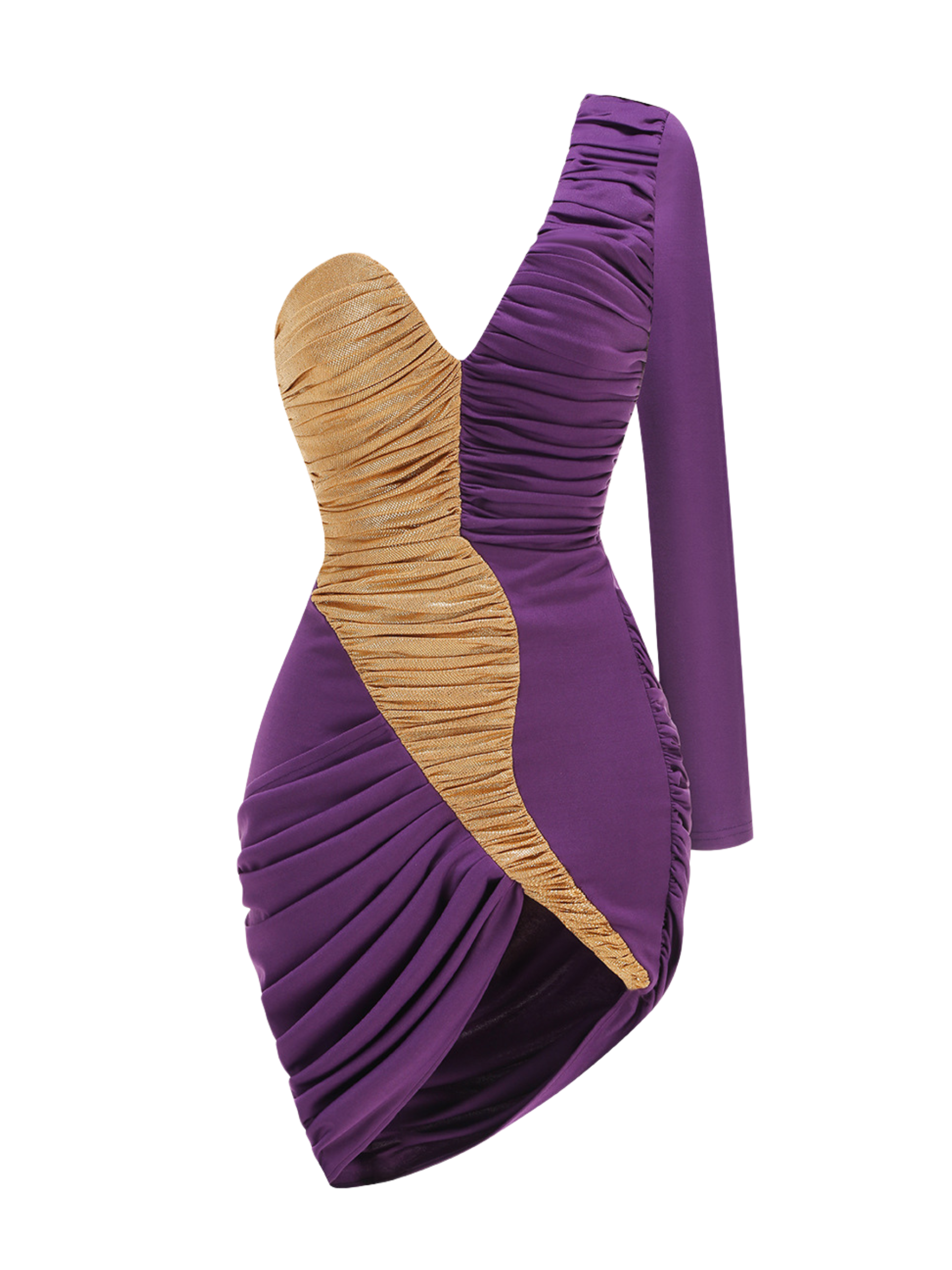 The Berlin Asymmetrical Ruched Mini Dress is the ultimate statement piece for a bold. fashion-forward look. Crafted in a stunning deep purple hue with metallic gold ruching details. this dress is designed to turn heads. The asymmetrical neckline and one-shoulder long sleeve create a striking silhouette. while the draped ruching enhances your curves effortlessly. The fitted bodice cinches at the waist. complementing the ruched skirt with a high slit for an added touch of allure. Perfect for a night out. a cocktail party. or any occasion where you want to make an unforgettable entrance.
