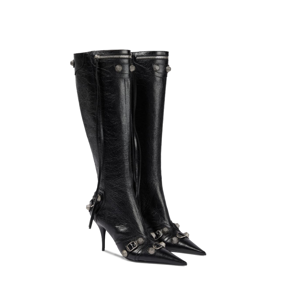 The Cagole knee-high boots feature grooved rivets. They're made from grained leather and feature decorative buckles with a pointed toe and stiletto heels.