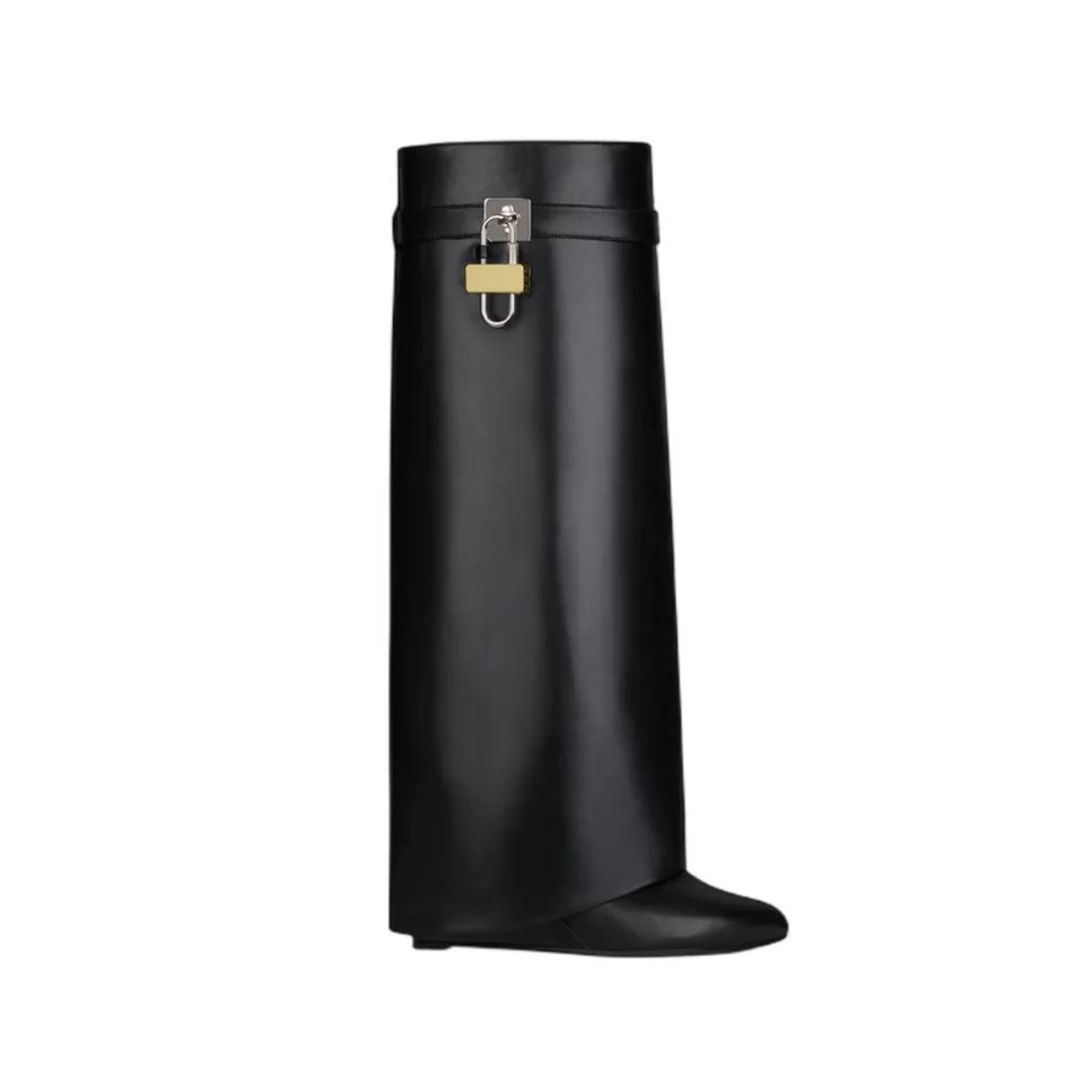Made from Vegan leather. theses stylish boots are designed with a metal clasp around the leg with silver-finish asymmetrical padlocks on the sides. They're finished with an almond-toe silhouette and covered wedge heels.
