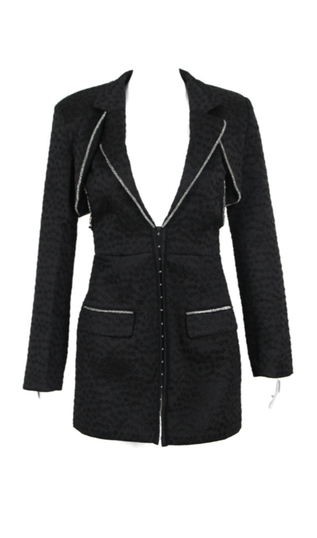 This Teri Blazer Dress in Black is expertly fitted for a sophisticated and chic look. The bolero jacket is seamlessly attached to create the perfect all in one dress meets blazer set style. Crafted from a luxuriously textured fabrication whilst adding a touch of glamour with her diamante trim. the is an elevated and edgy style that'll be sure to make a daring statement at your next special occasion.
