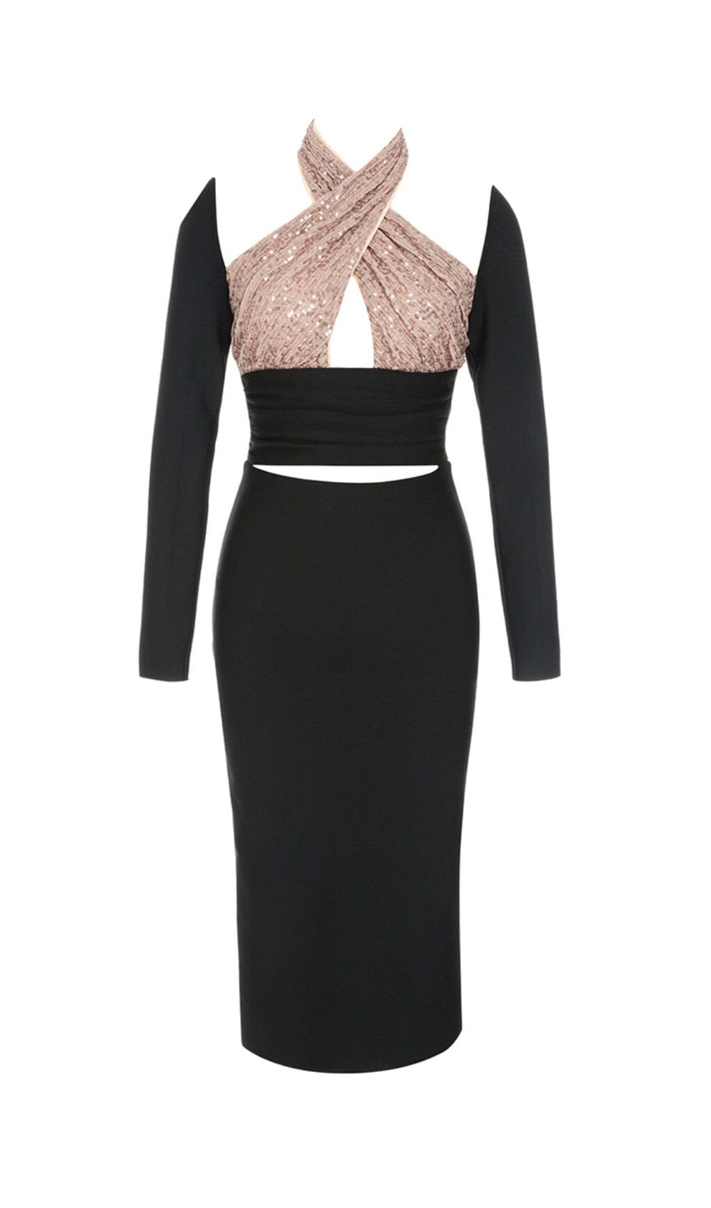 BLACK STITCHED HALTERNECK DESIGN MIDI DRESS