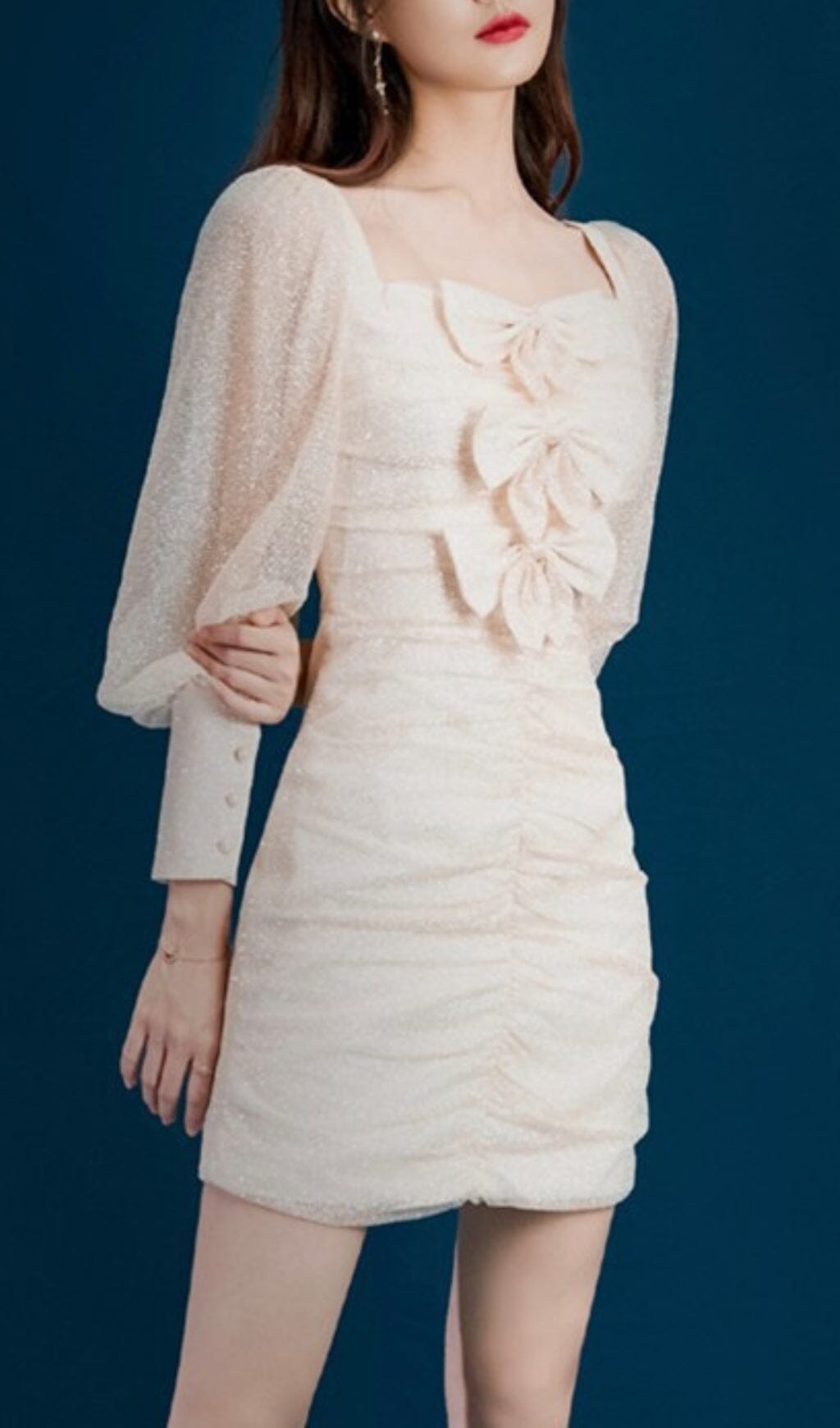 BOW STREAMER MESH PLEATED DRESS IN BEIGE