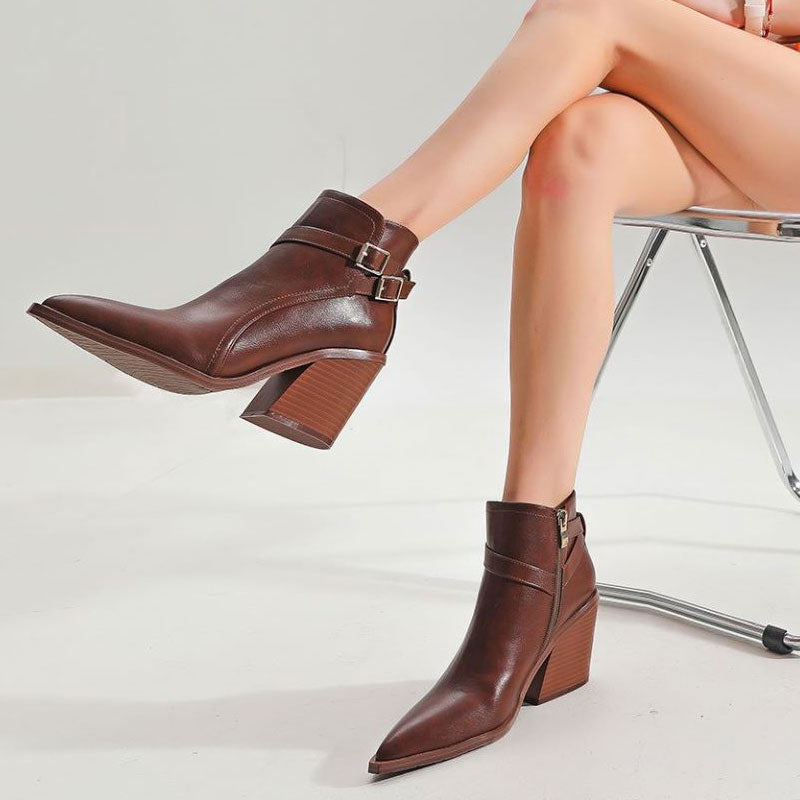 Chelsea Style Pointed Toe Buckle Strap Block Heel Ankle Boots - Dark Brown