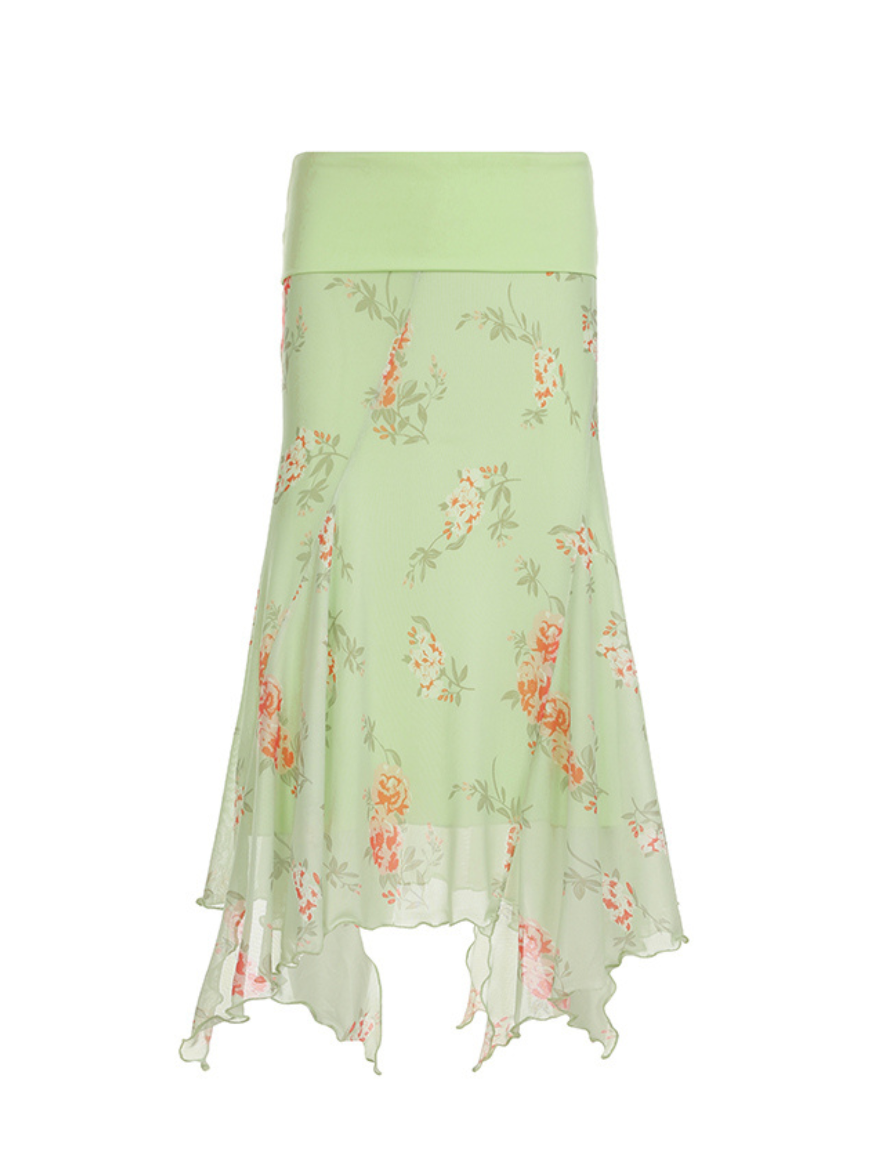 Cherly Floral Mesh Skirt adds a whimsical touch to your summer wardrobe. Crafted from airy chiffon in a soft mint green hue. it features a delicate floral print in peach and coral tones. The standout detail is the handkerchief hemline that moves beautifully with every step. creating a dreamy. fairy-like silhouette.