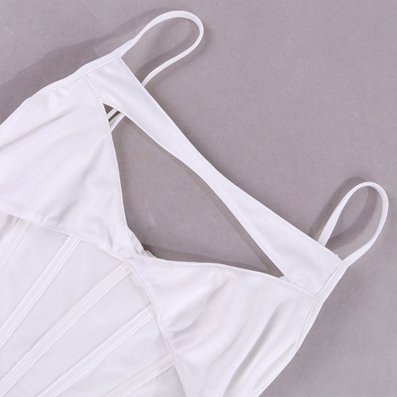 Cut Out Mesh Trim Sleeveless Curved Hem Crop Corset Top - White