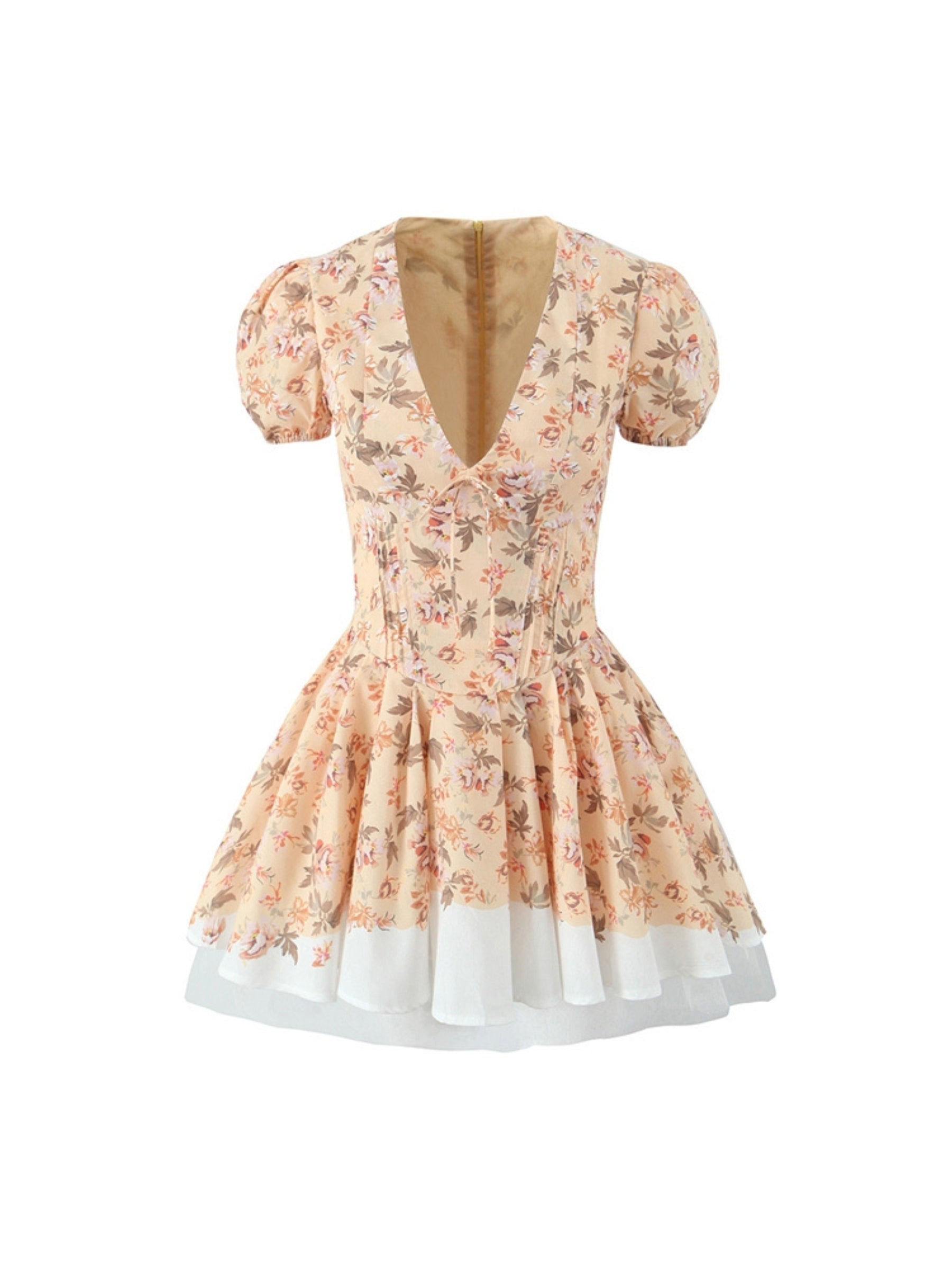 The Clarisse Puff Sleeve Floral Mini Dress embodies playful charm and classic femininity. Featuring a sweetheart neckline and structured bodice. this mini dress offers a corset-inspired silhouette for a flattering fit. The delicate floral print in soft. pastel tones gives it a romantic vibe. while the puff sleeves add a touch of vintage-inspired elegance. With a flared. layered skirt. it's perfect for twirling at garden parties or outdoor gatherings. The lightweight fabric and puff sleeves make it a comfortable yet chic choice for warm-weather outings.