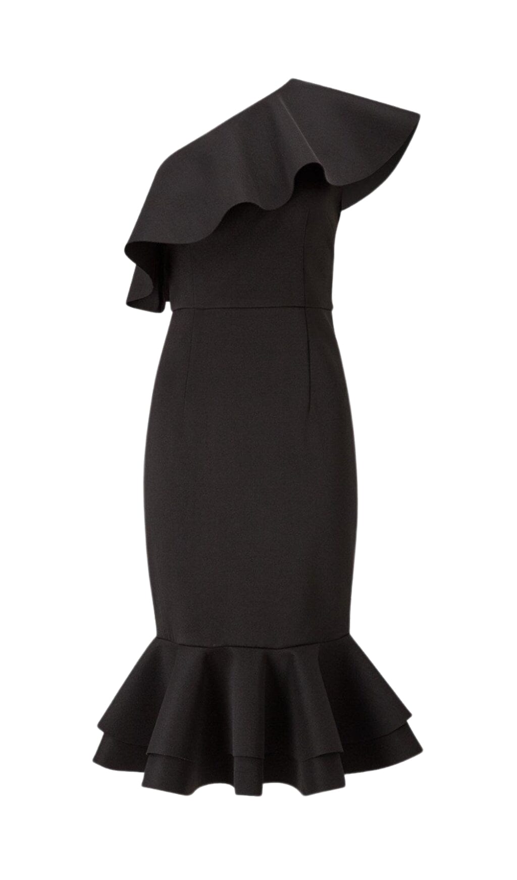 CROSS-SHOULDER RUFFLED FISHTAIL DRESS IN BLACK