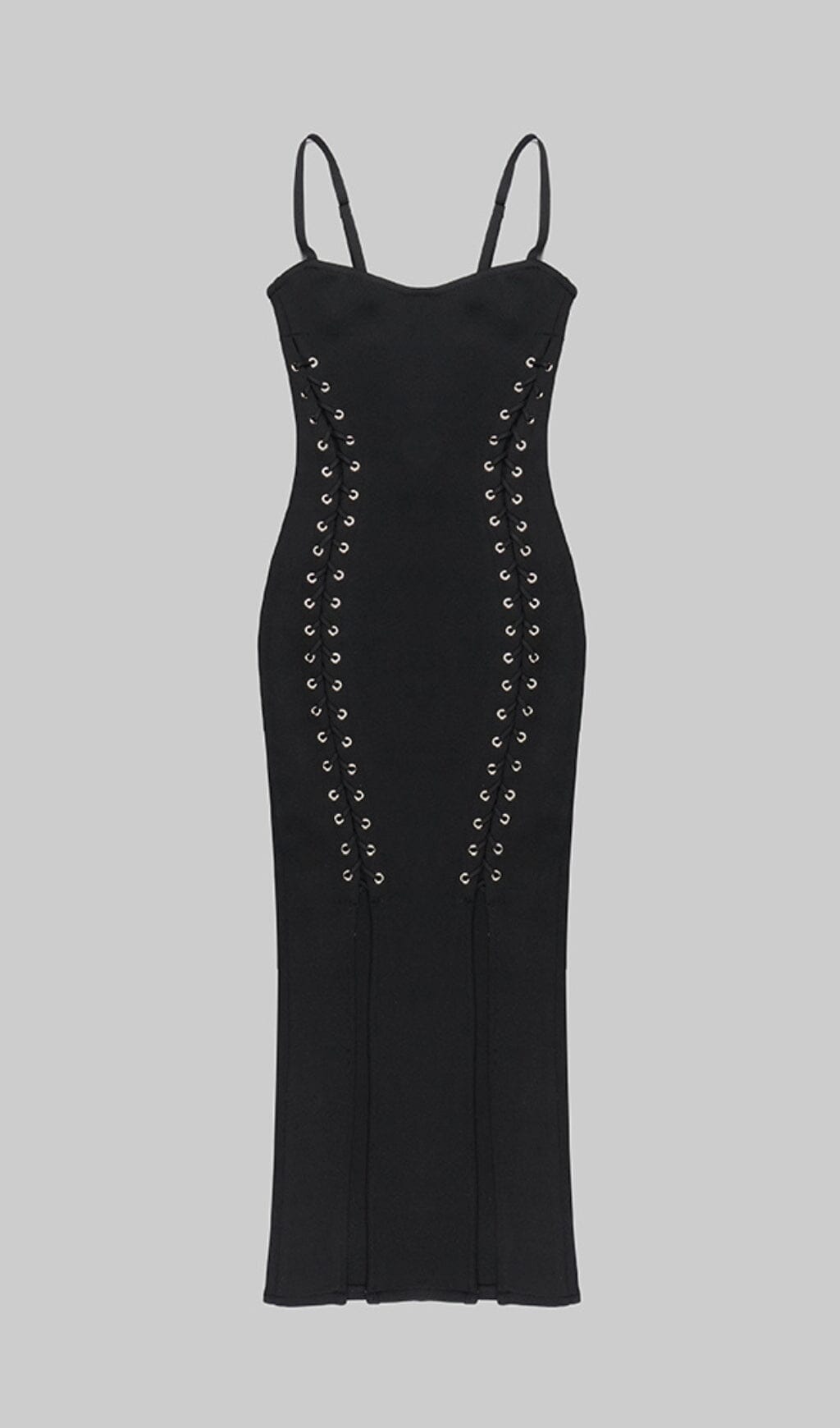 This stylish black midi dress features a cutout side detail to add an elegant touch. Its sleek silhouette is crafted with the finest materials. making this dress the perfect choice for any special occasion.