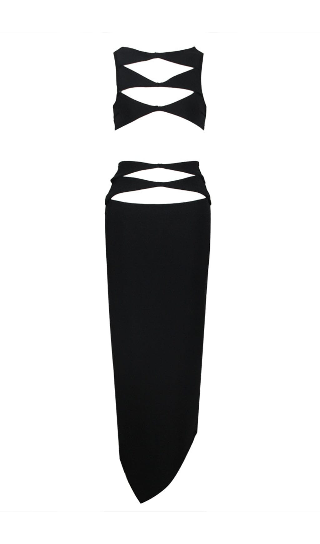 This stunning ensemble features a crop top with a daring cutout at the front and matching high-waisted skirt with cutout details at the sides. The black fabric is stretchy and comfortable. hugging your curves in all the right places.