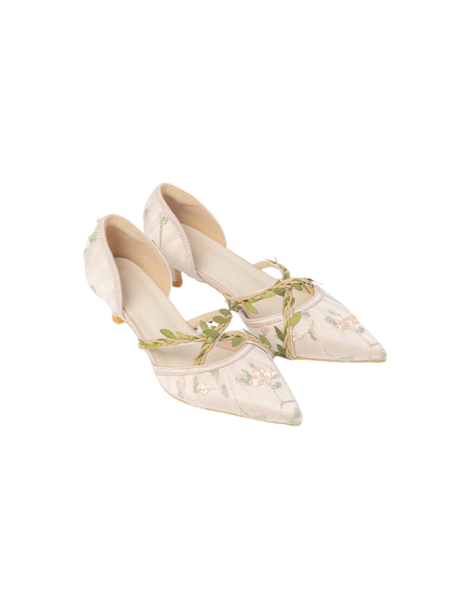 Step into elegance with these beautifully crafted heels. featuring delicate floral embroidery and a pointed-toe design. The soft beige tones and intricate vine details make them perfect for special occasions or adding a romantic touch to your everyday style.