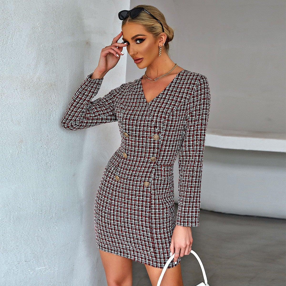 This fitted mini-dress is made from soft fabric with a comfortable. stretchy fit. It features a double-breasted closure with a slim waistline and a zipper closure in the back. Its length allows for a stylish. slim silhouette and provides coverage and comfort for both work and leisure. The durable material and easy-care construction mean you can look stylish and confident with minimal effort.