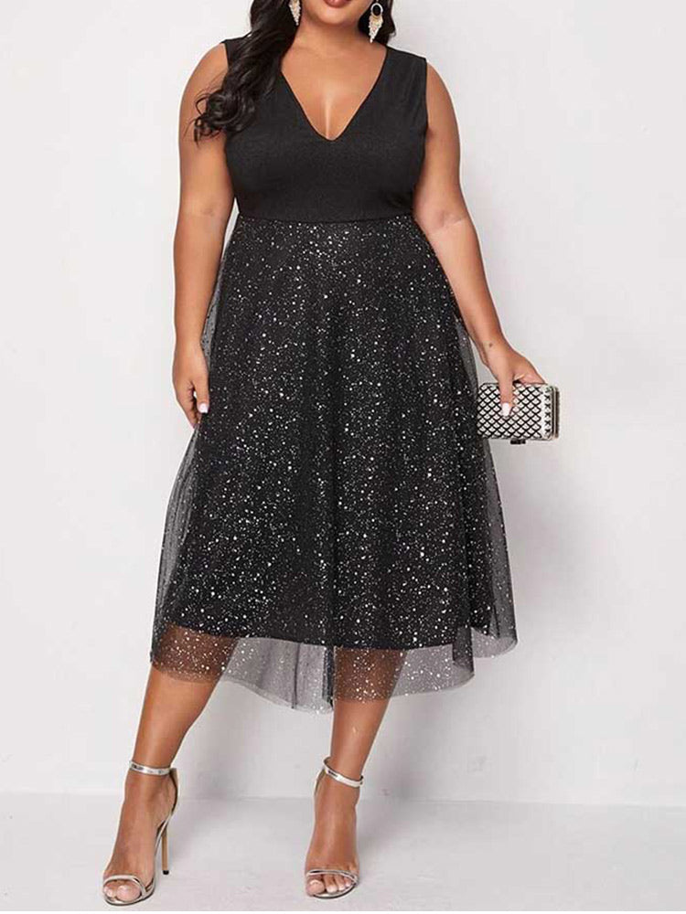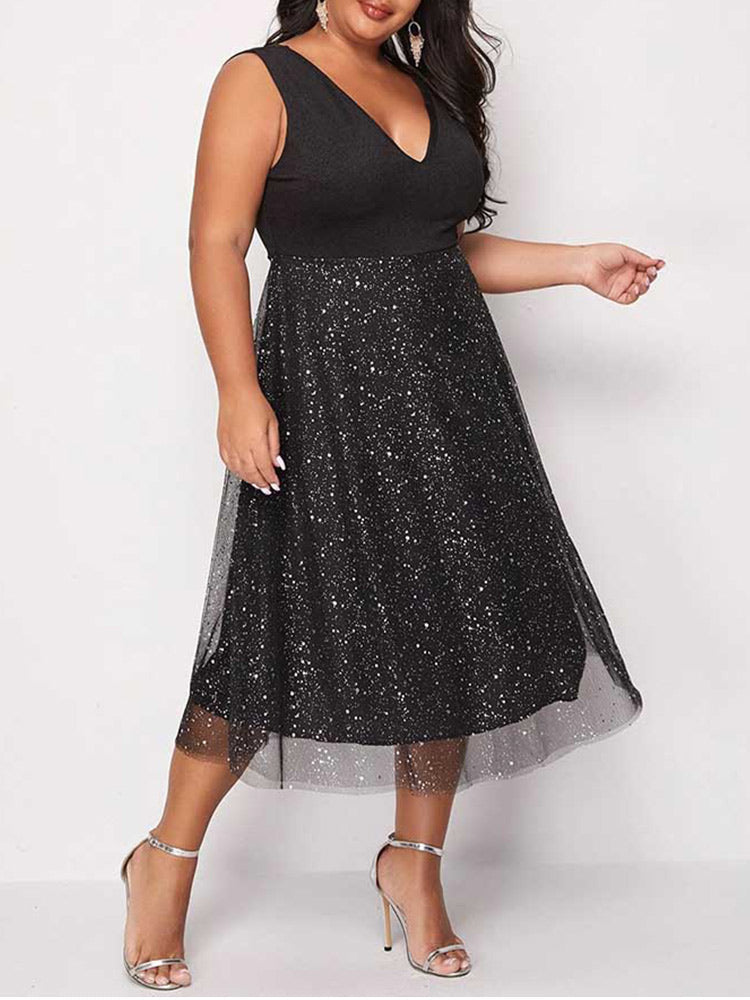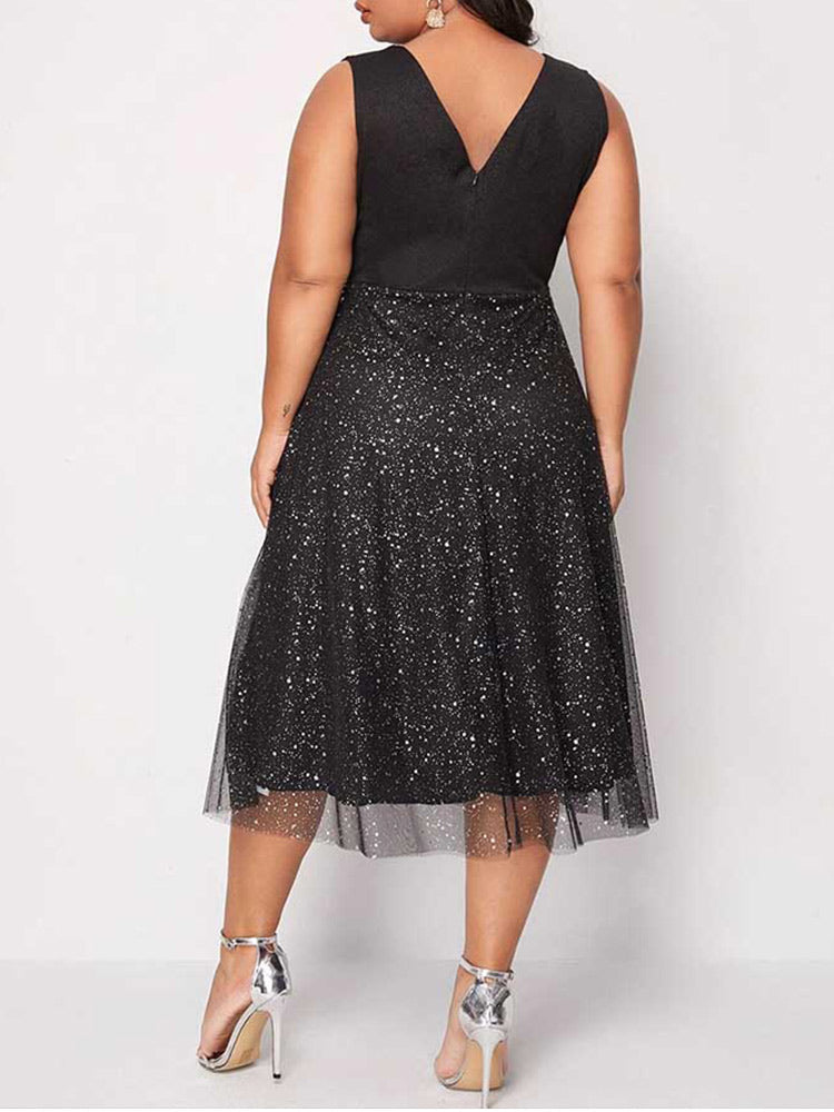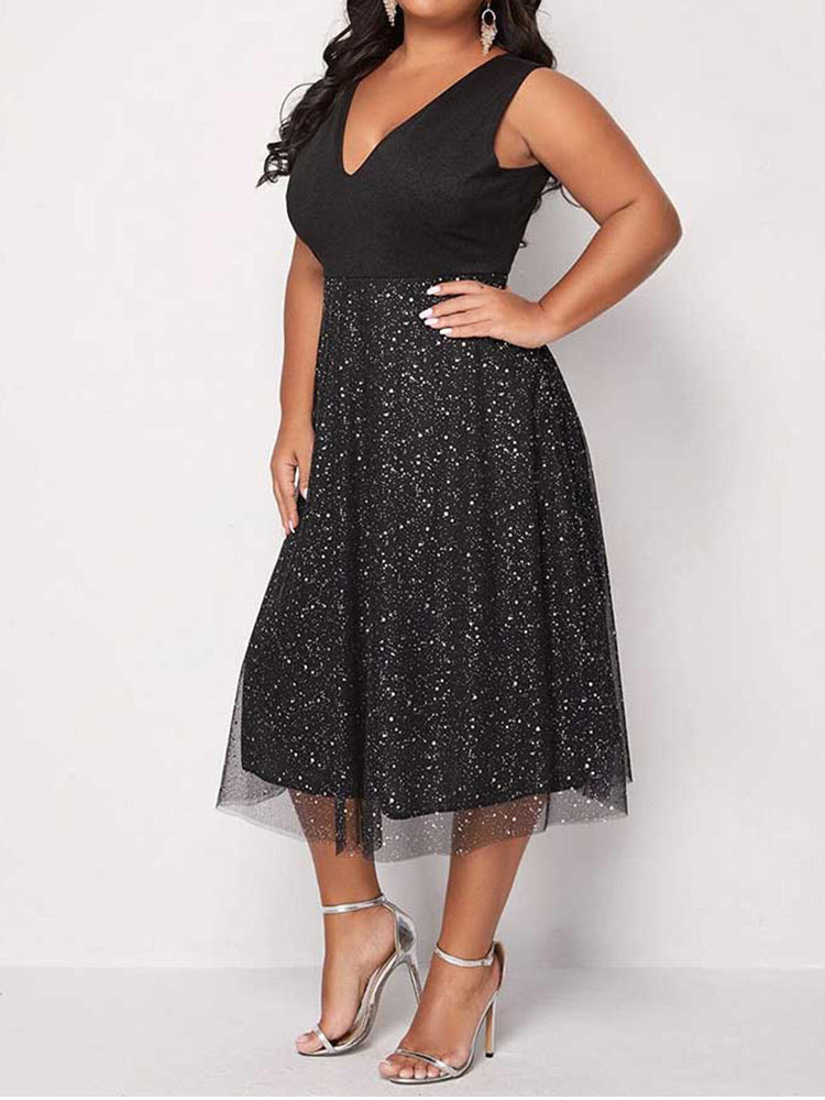 Double V Neck Contrast Mesh Midi Dress
