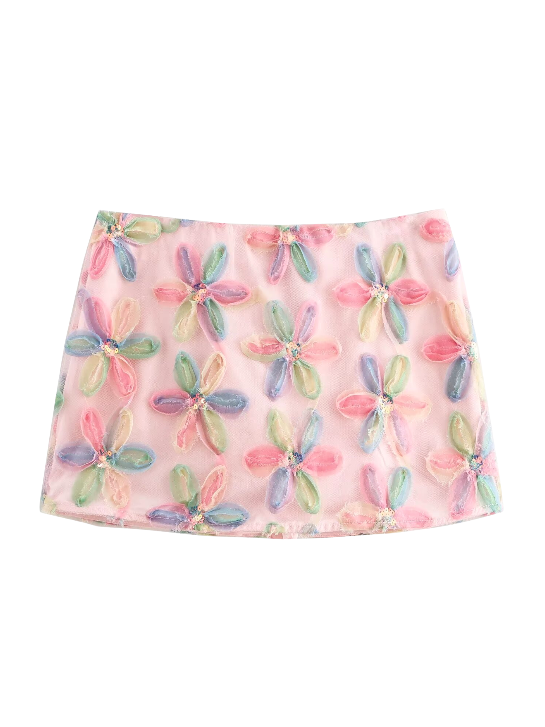 Make a sweet and dreamy statement with the Drea Floral Embroidered Mini Skirt. This pastel pink mini is adorned with whimsical 3D flower appliqués in soft rainbow hues. giving it a fairycore. ultra-girly vibe. The delicate mesh overlay and subtle sequin accents add shimmer and depth. making it perfect for your next brunch date or picnic look.