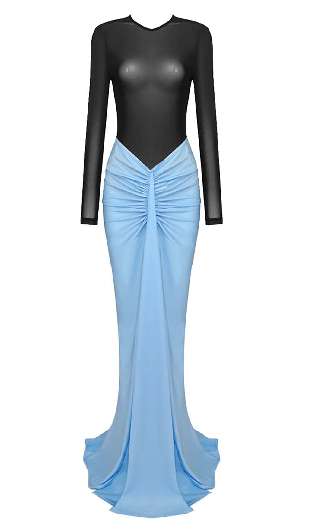 DROPPED WAIST RUCHED MAXI DRESS IN BLUE