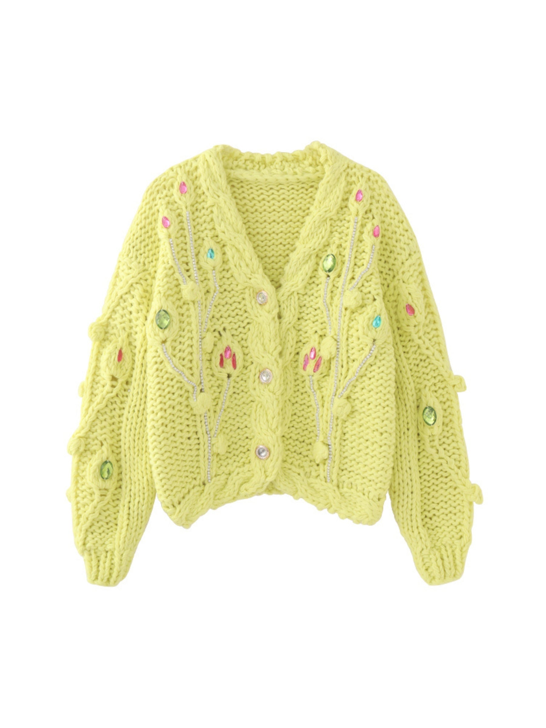Add a playful twist to your winter wardrobe with the Emilia Embellished Knit Cardigan in Lime. This cozy cardigan is adorned with colorful jewel-like accents that add a fun. eye-catching detail to the chunky knit texture. The luxurious warmth of the thick fabric combined with the intricate designs along the sleeves and front makes it a unique and stylish piece for the colder seasons. Perfect for layering over casual or semi-formal outfits. Emilia ensures you stand out while staying comfortably warm.