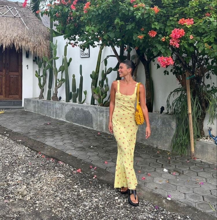 The Emory Floral Maxi Dress in Yellow will have you feeling like a sunshine goddess! It's printed with a mini floral pattern and fits like a dream thanks to the soft elastic fabric. Plus. the U-neck. wide straps. and bodycon fit make it the perfect flirty dress for summer! Who said good things can't come in small packages? Aesvs - Summer's in Bloom Collection!
