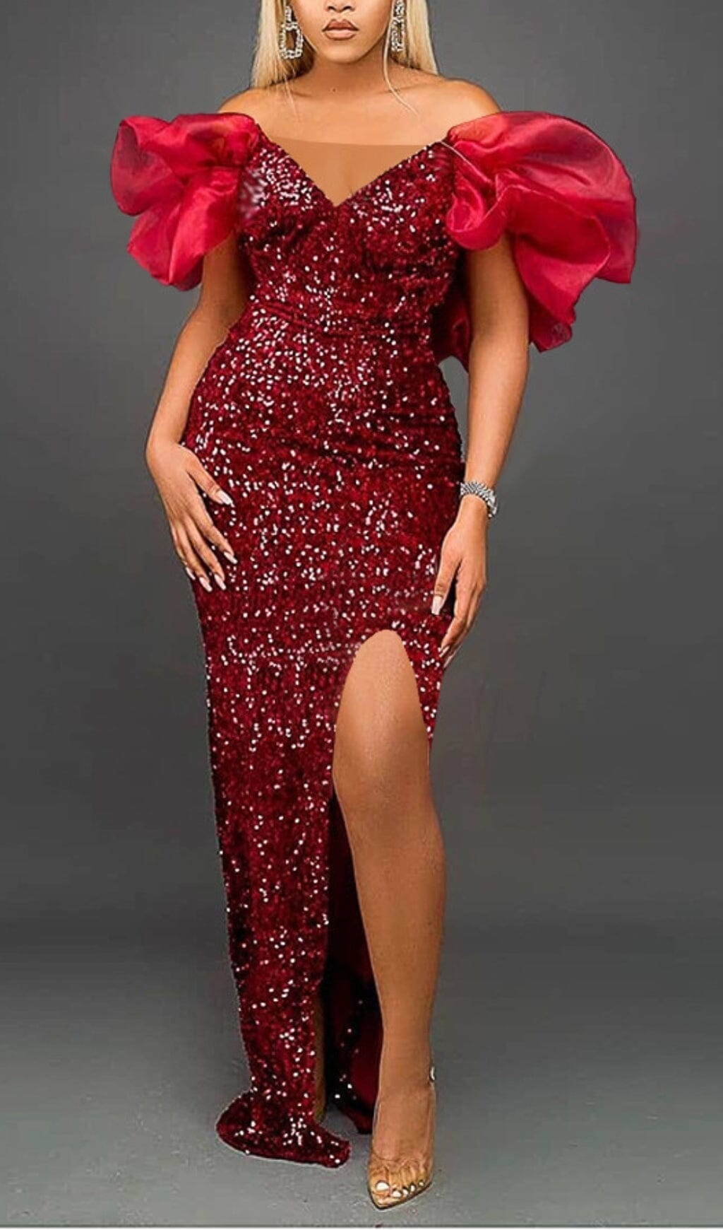 This puff-sleeved red sequin dress is very suitable for the holiday robe. Red can highlight the complexion well. and it is also full of a strong festive atmosphere. It looks particularly exquisite and age-reducing with sequins. The irregular stacking of cuffs can well coordinate the head-to-shoulder ratio. which is very French romantic. lazy and fashionable. and is very suitable for parties on various festivals.
