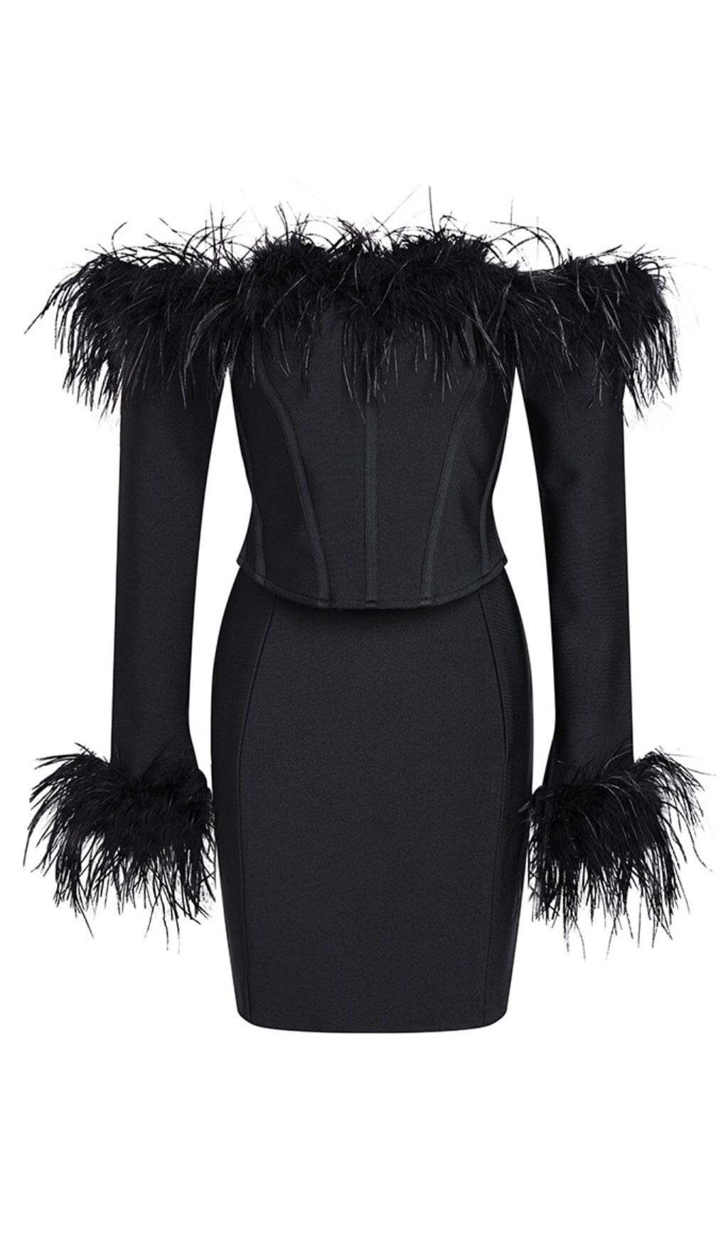 One of the standout features of this dress is the luxurious feather trim that lines the hem of the skirt. giving it a playful and feminine touch. The corseted bodice is also adorned with a delicate lace-up detail that adds a touch of glamour and sophistication.
