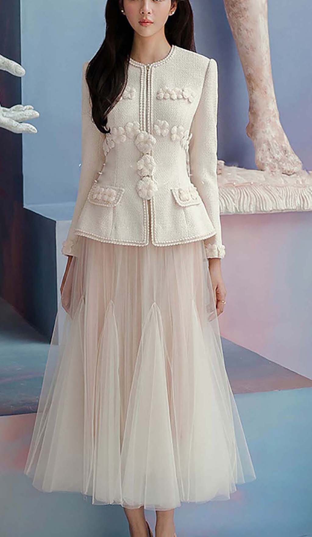 FLORAL EMBELLISHED DRAPED TWO PIECE SET IN BEIGE