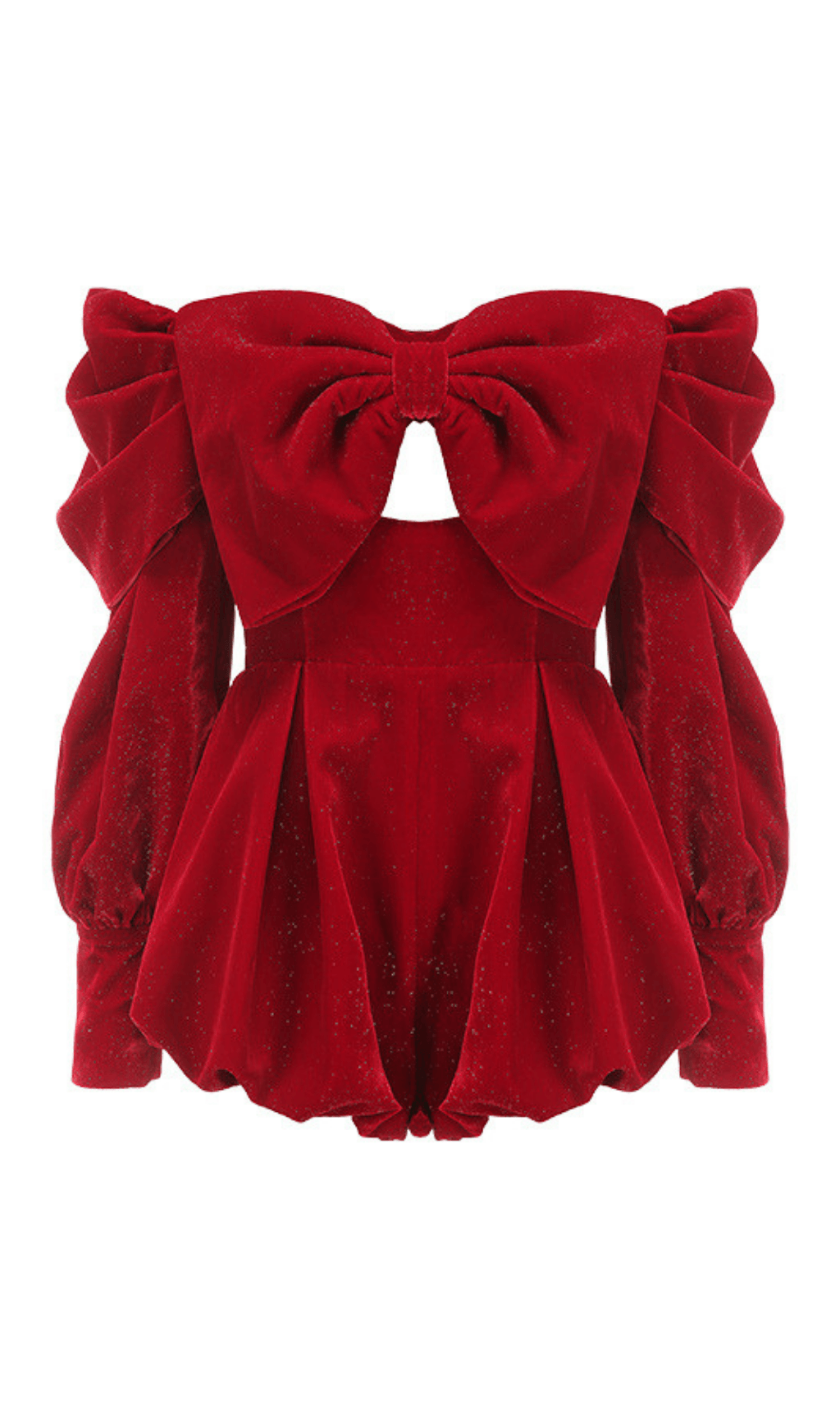This is a jumpsuit with bloomers. But it is more like a mini dress. and more lovely in charming. With statement puff shoulders and long textured sleeves. we're so ready for festive nights out in this one. You're the gift here. honey.