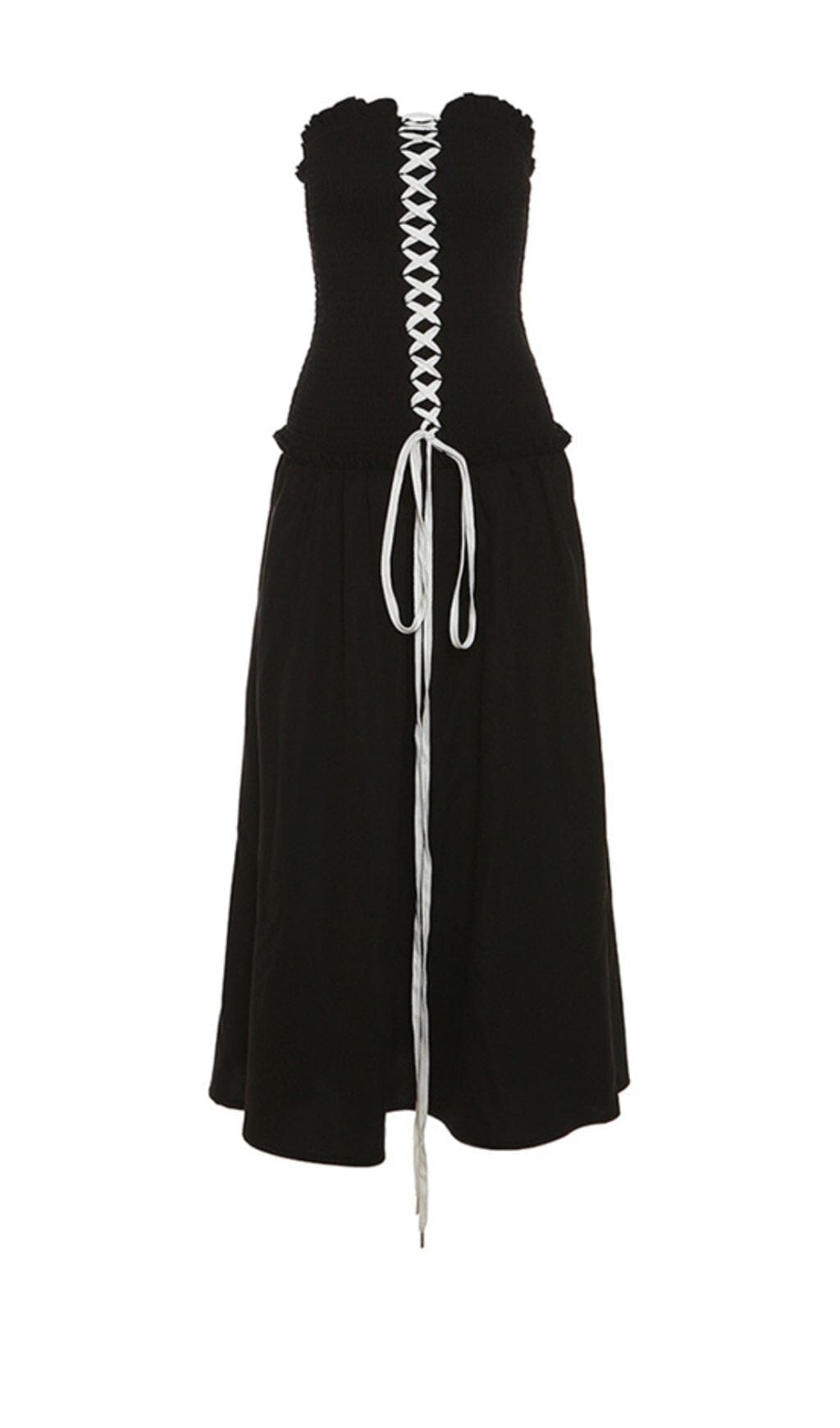 Make a dramatic entrance in this strapless maxi dress with edgy front lace-up detailing. The floor-length dress create an alluring silhouette while the black shade exudes mystery and glamour. Front-and-center corset lacing allows you to customize the fit. Pair with your highest heels and favorite jewels for a show-stopping formal look.