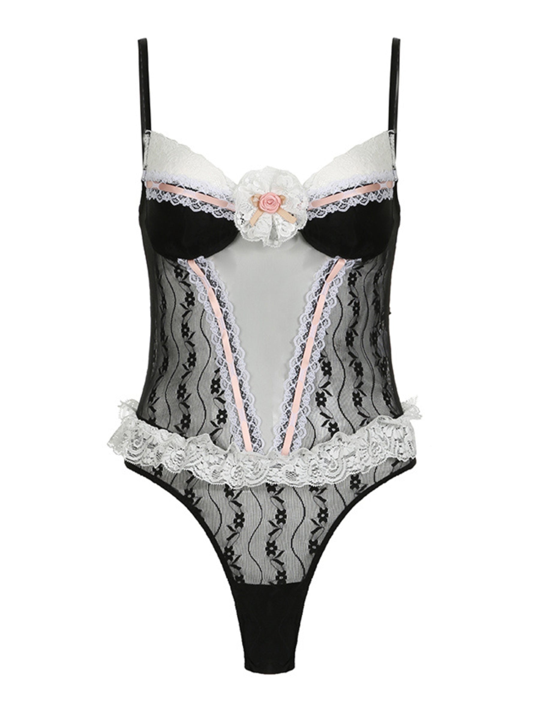 Introducing the Giana Lace Bodysuit in Black from the Aesvs Modern Romance Collection. This one-piece features a floral detailed neck and ruffle lace waist for a romantic and elegant look. The slim fit and mesh top add a touch of sexiness. making it perfect for any French-style outfit. Available in both white and black.