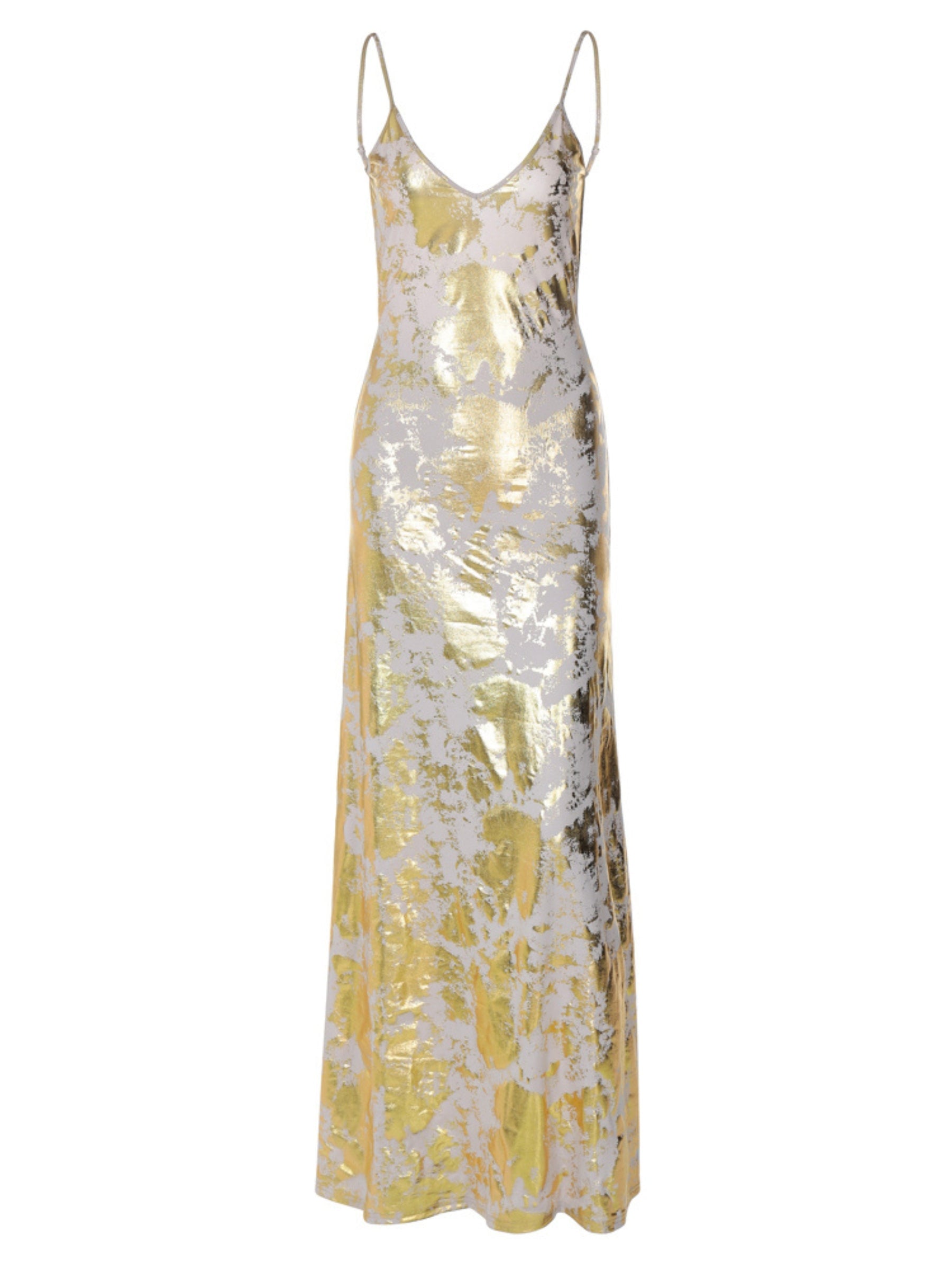 The Haily Backless Maxi Dress in Gold is a stunning addition to the Aesvs Spring-Summer Collection. Its sleeveless design. deep V-neck. and adjustable spaghetti straps create a slim fit that hugs your curves in all the right places. Made with metallic fabric. this dress exudes a sexy and playful vibe.