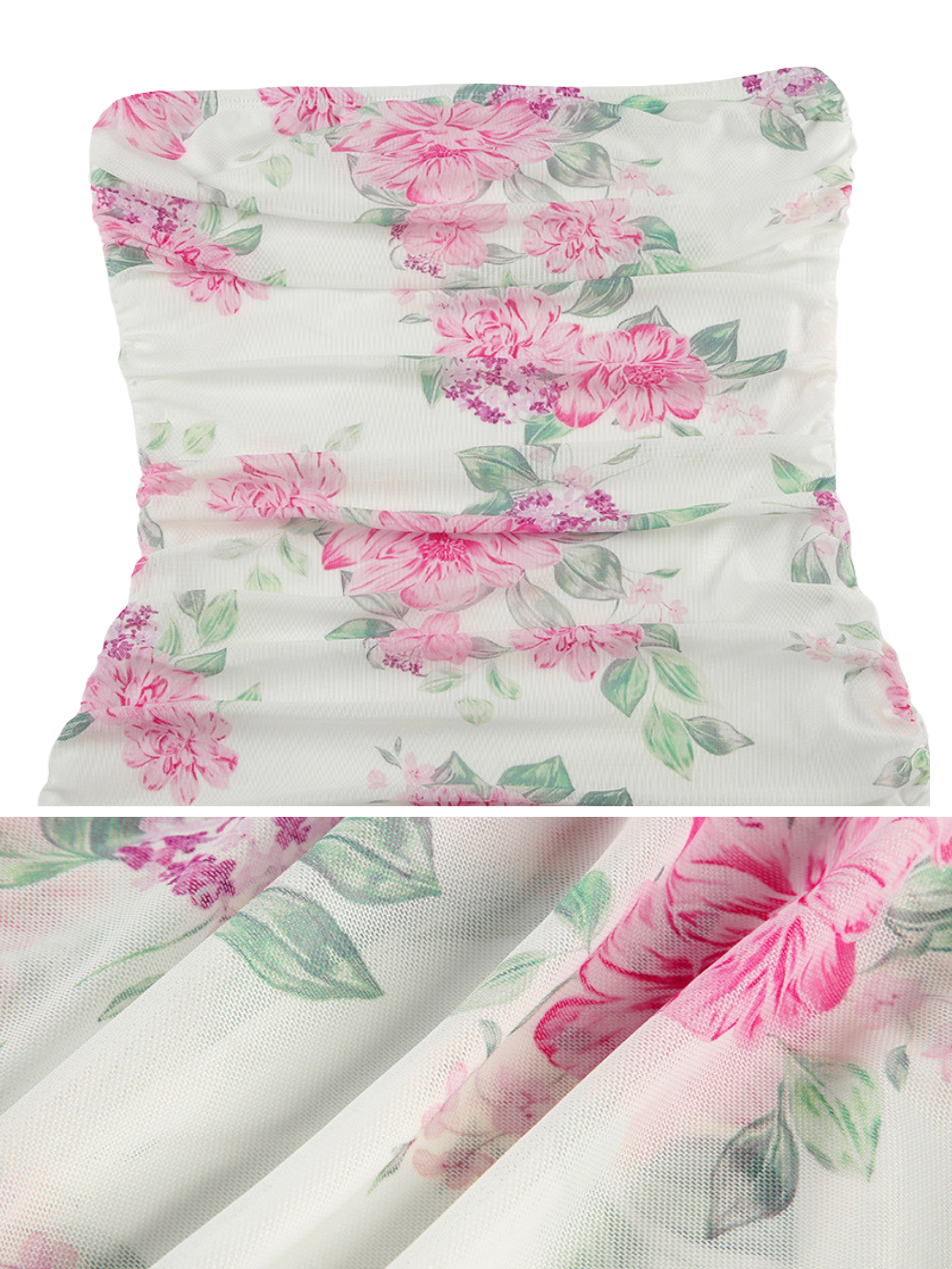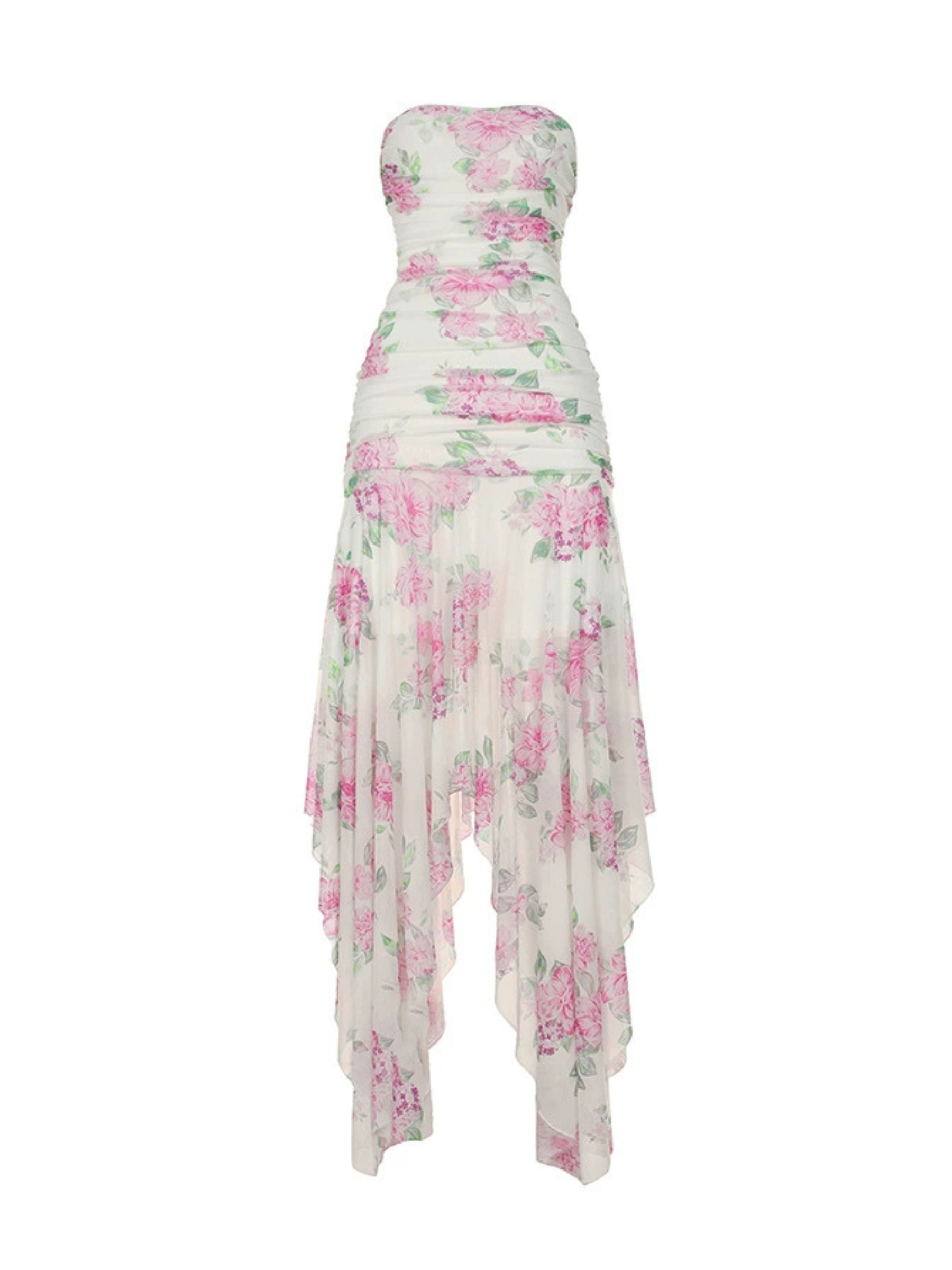 The Haley Strapless Floral Dress is the perfect mix of romantic charm and ethereal flow. Featuring a soft cream base with dreamy pink rose prints. this strapless maxi hugs the body through the ruched bodice and then cascades into a layered handkerchief hem for a fairy-like finish. Lightweight and breezy. it's made for garden parties. beach weddings. or any moment you want to feel effortlessly stunning.