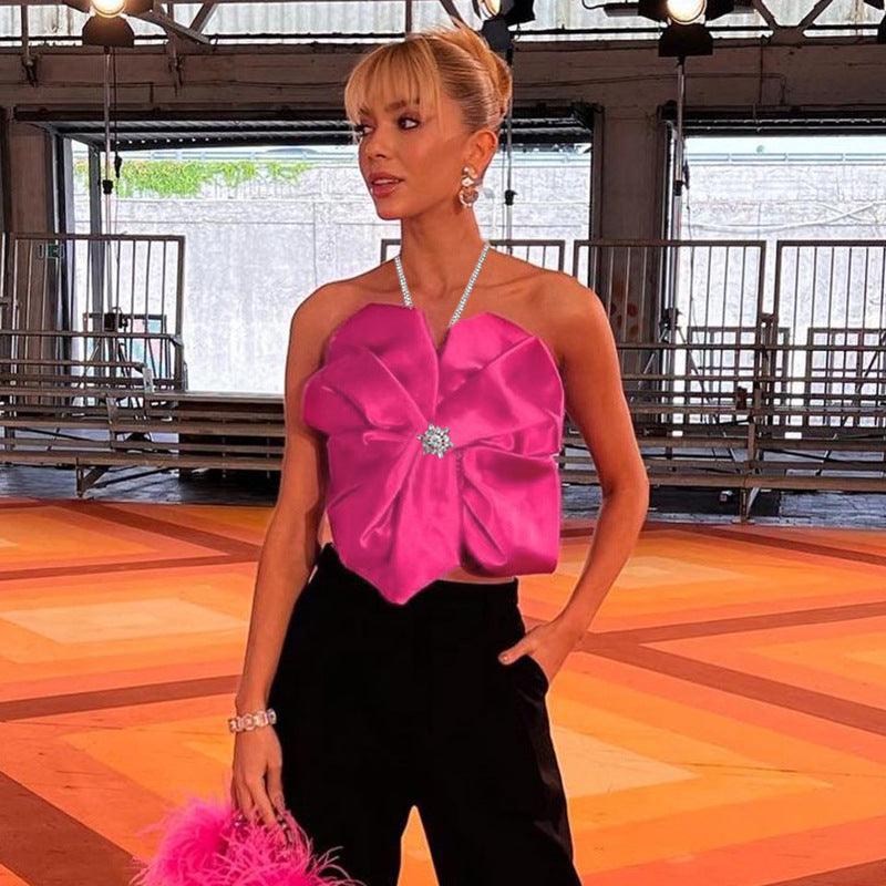 This hanging neck big flower strap top features an elegant look and a comfort fit design. It's made with light and breathable fabric. making it easy to wear all day. The adjustable drawstring hood provides additional warmth and features a stylish flower pattern throughout. This top is perfect for any occasion. offering a sophisticated look and luxurious feel.