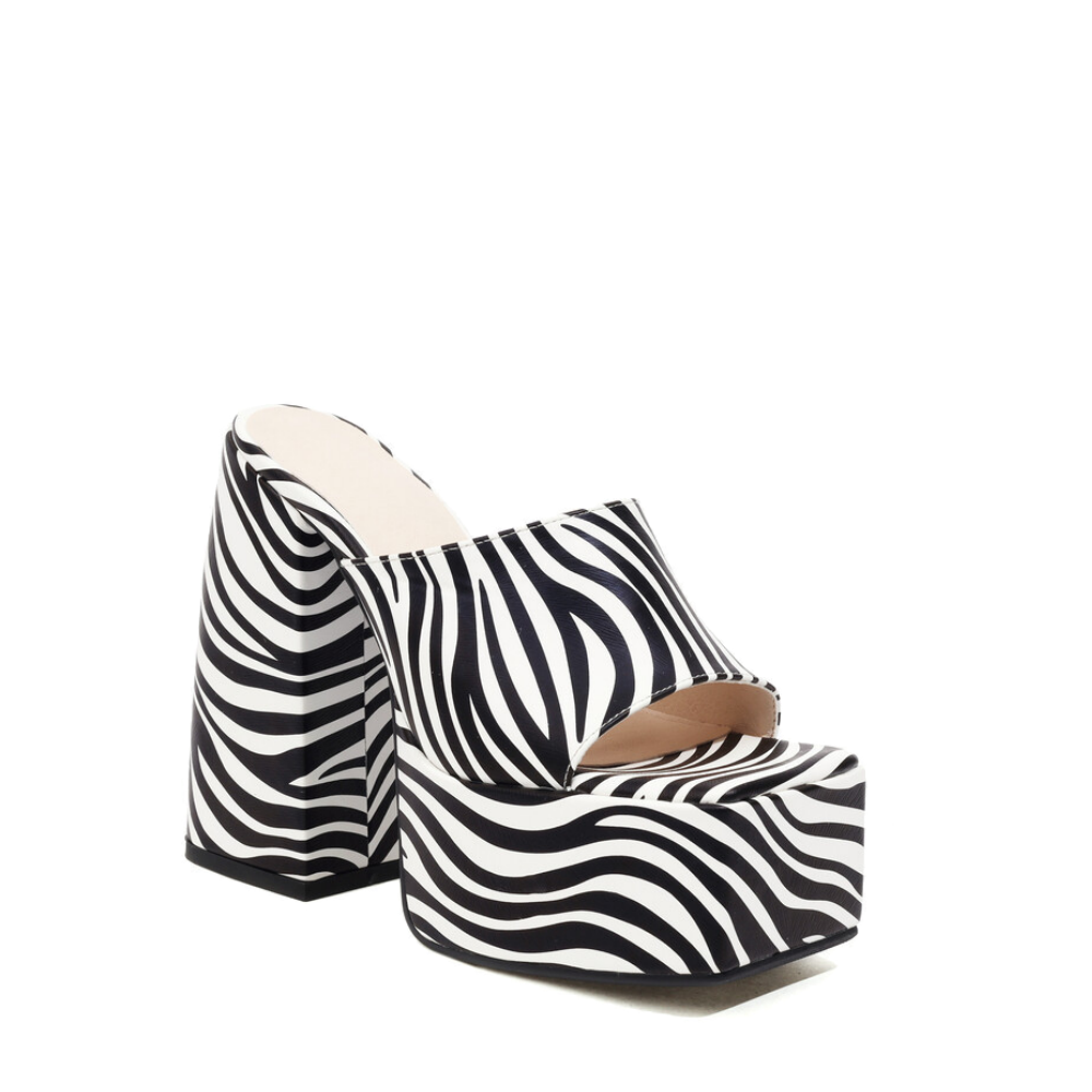 Zebra print is hot right now. This is a must-have pair of chunky. platform heels that are guaranteed to make a statement. Be bold with your look this season.