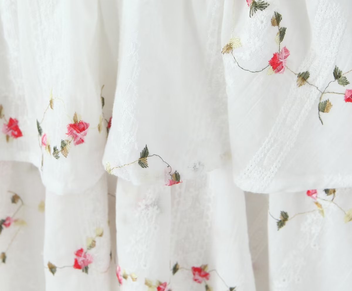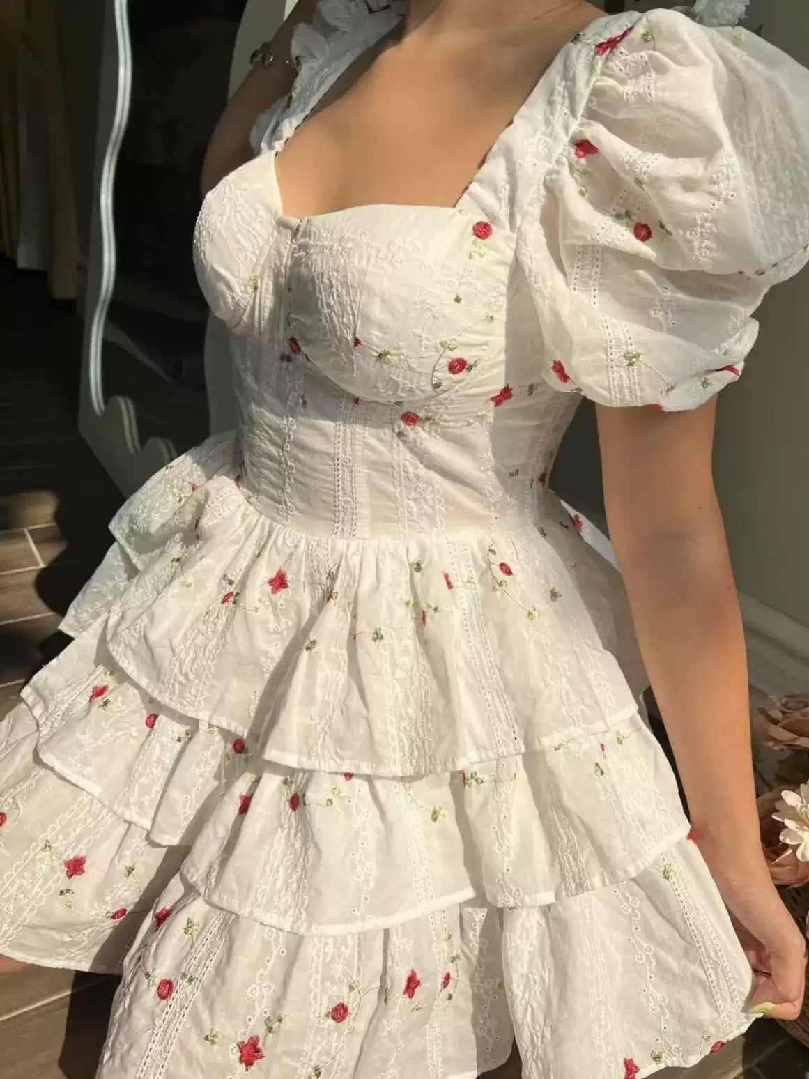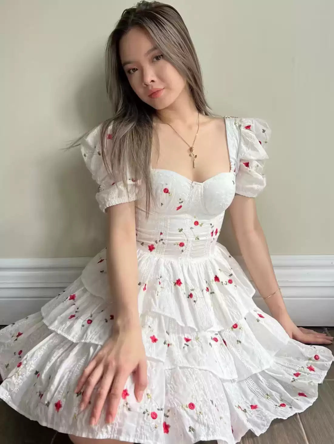 The Irelyn Floral Corset Mini Dress is the ultimate blend of romance and elegance. Featuring a structured corset bodice with delicate floral embroidery. this dress cinches at the waist to create the perfect hourglass silhouette. The puffed sleeves add a dreamy touch. while the tiered ruffle skirt enhances the feminine charm. Designed in a crisp white fabric with vibrant red floral accents. this dress is perfect for brunch dates. summer getaways. or dreamy picnics.