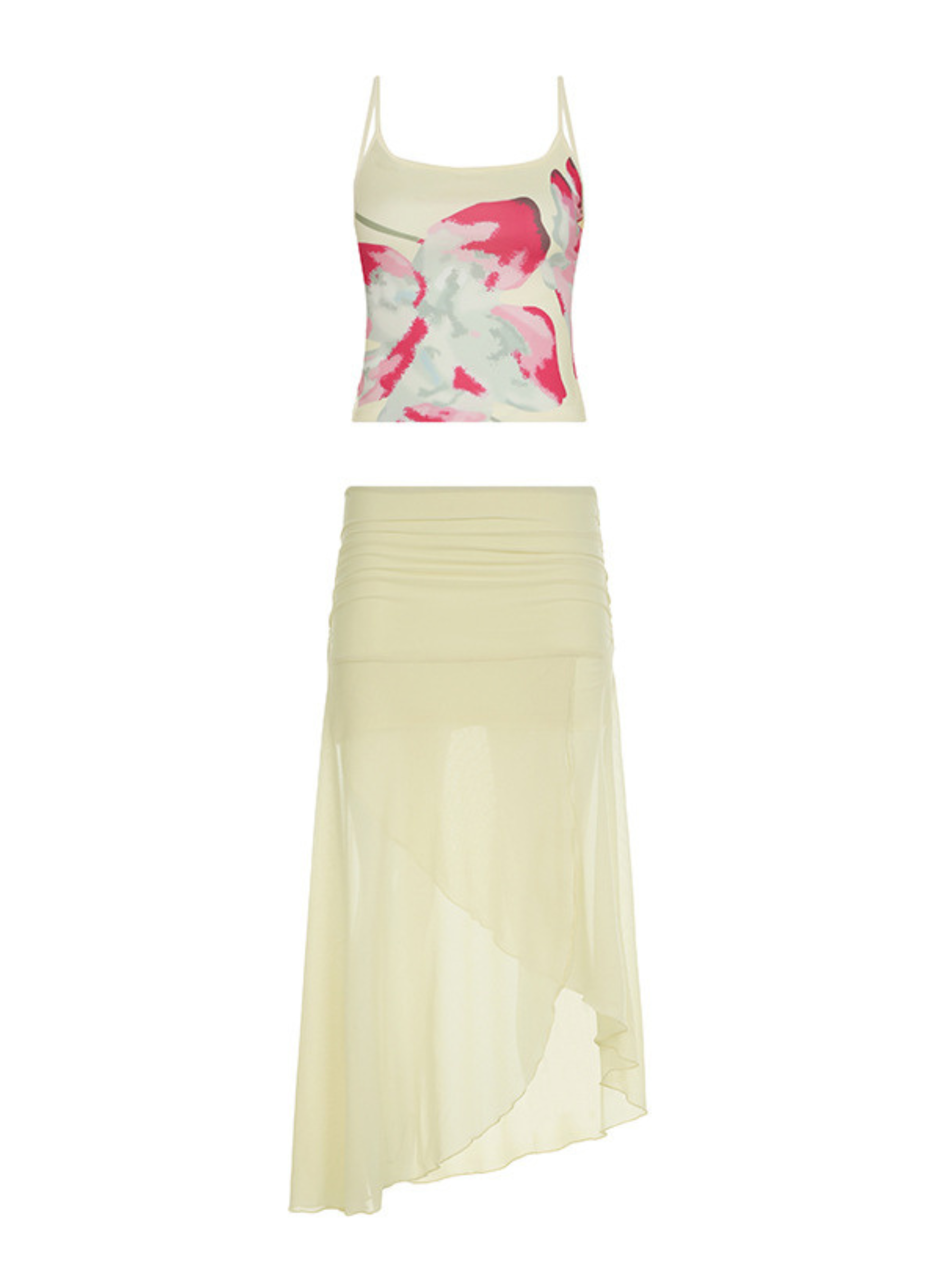 Experience a touch of whimsy with our Jamia Mesh Asymmetric Skirt Set. This two-piece set includes a cami top and sheer skirt in a light yellow base with a watercolor-style pink floral print. The lightweight. flowy fabric with soft stretch and the asymmetric hemline add a romantic edge. Perfect for beach days. summer dates. or vacation styling. From the Aesvs Spring-Summer Collection.