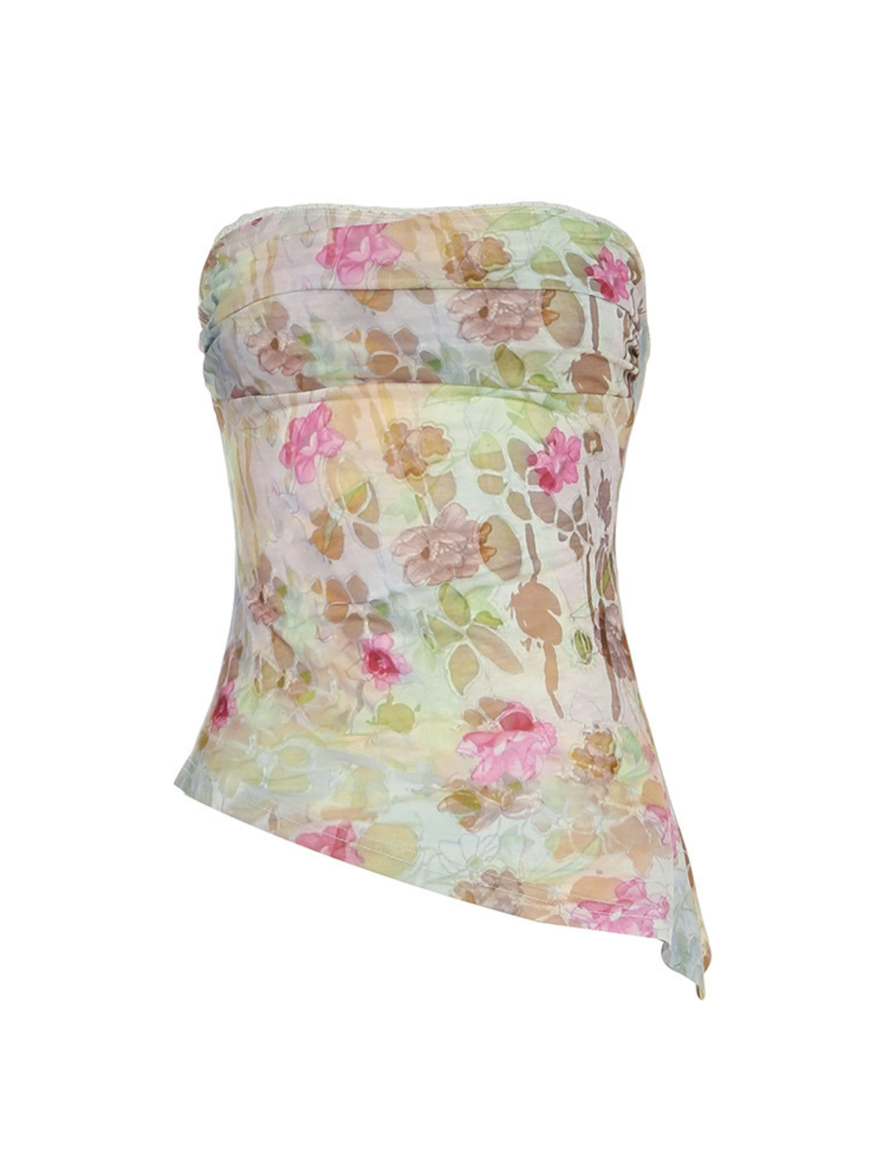 Introducing the Kaily Mesh Floral Strapless Top from Aesvs' Spring-Summer Collection! Made from lightweight mesh fabric with a beautiful floral print. this top features soft ruched details. a strapless tube design. and an asymmetrical hem. Perfect for layering over bralettes or bikinis. it's both stylish and breathable.