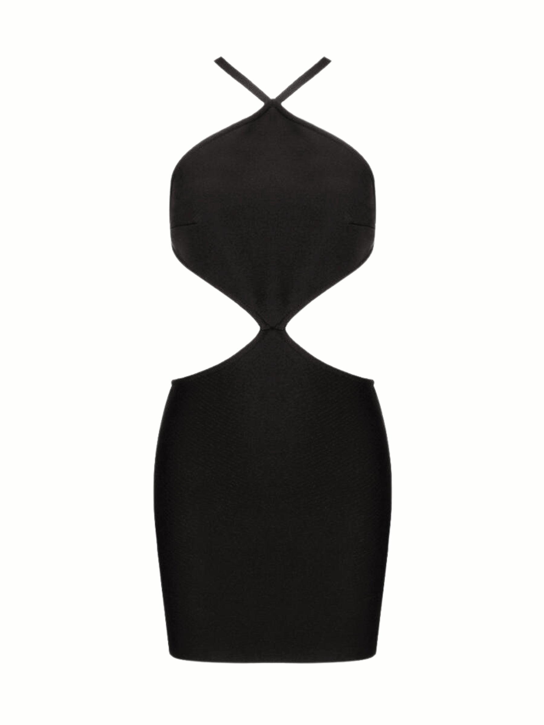 Our Kasie Cross Back Mini Dress is the perfect outfit for your next night out! This chic dress features a halter neckline and irregular design for a sultry. elegant look. Perfect for any 'Date Night'. you'll be ready to turn heads in this sleek and sexy black mini dress.