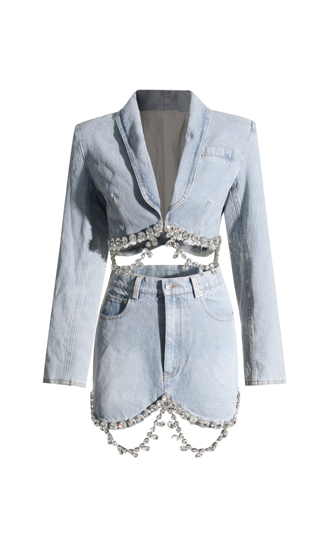 This Crystal Fringe Chain Denim Suit is the perfect way to elevate your office wardrobe. The durable denim fabric provides comfort and style. while the sparkling crystal fringe chain across the shoulder gives you a subtle hint of glamour. An essential piece for any fashion-forward professional.