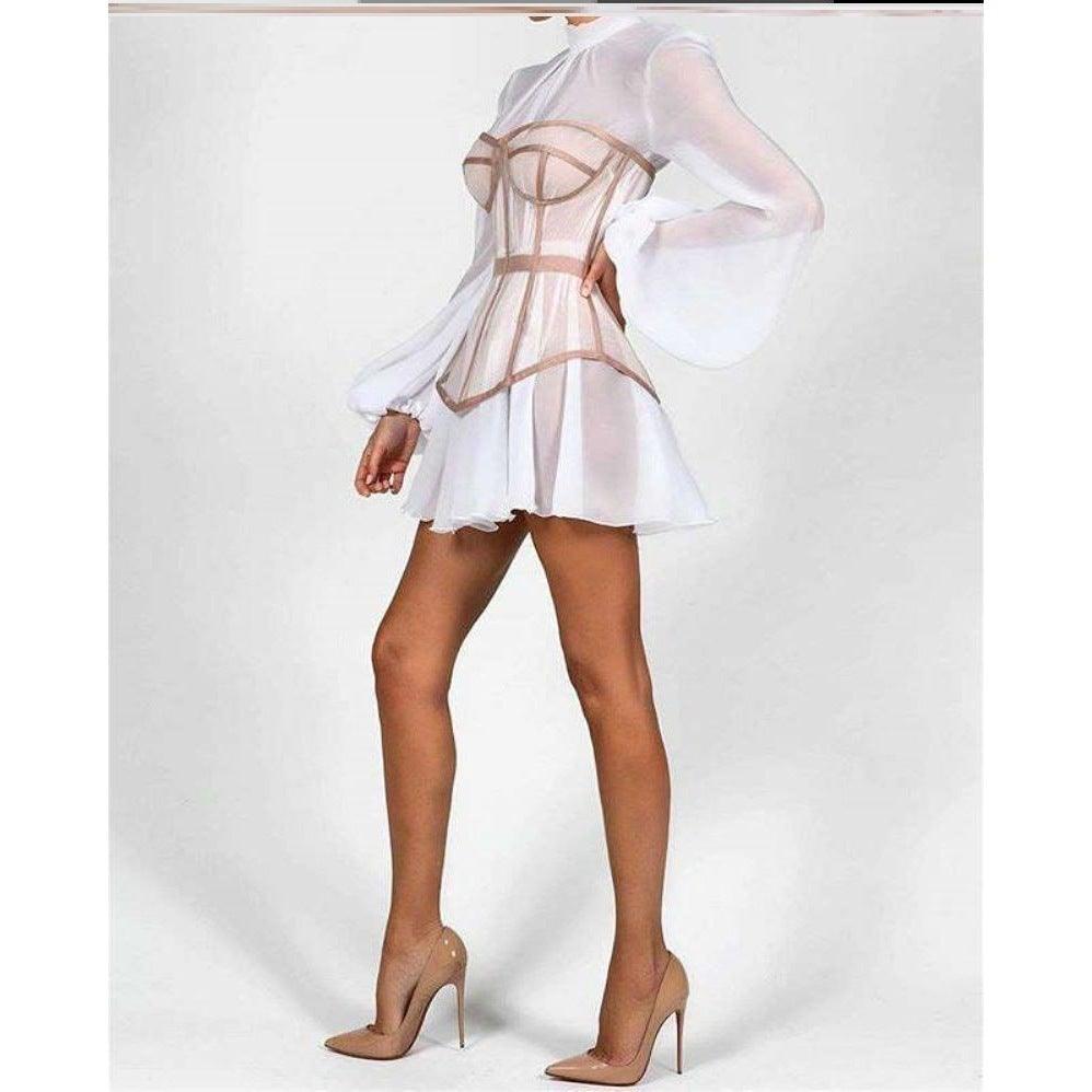 This sophisticated garment features a faux corset top and A-line skirt made of lightweight chiffon. The elegant lantern sleeves are beautifully stitched and showcase excellent craftsmanship. The asymmetrical hemline adds a touch of glamour while maintaining a classic silhouette. Perfect for any formal event.