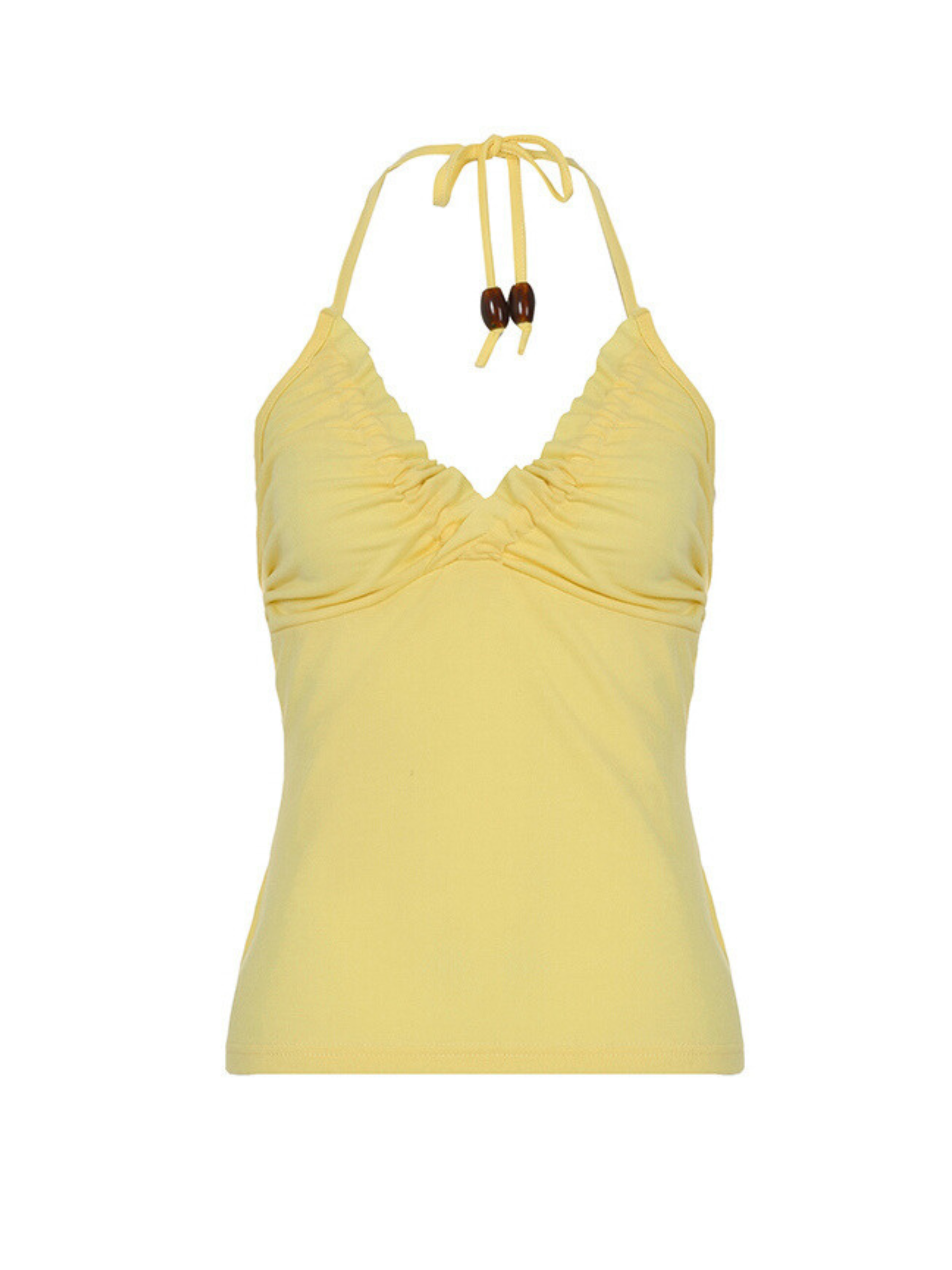 Add a touch of effortless charm to your summer wardrobe with the Leona Ruched Halter Top. This soft yellow top is designed with a flattering ruched bust and adjustable halter tie featuring wooden bead details for a boho-inspired accent. Its lightweight. stretchy fabric ensures all-day comfort while enhancing your natural silhouette. Perfect for pairing with denim shorts or a flowy skirt for a relaxed yet stylish vibe.