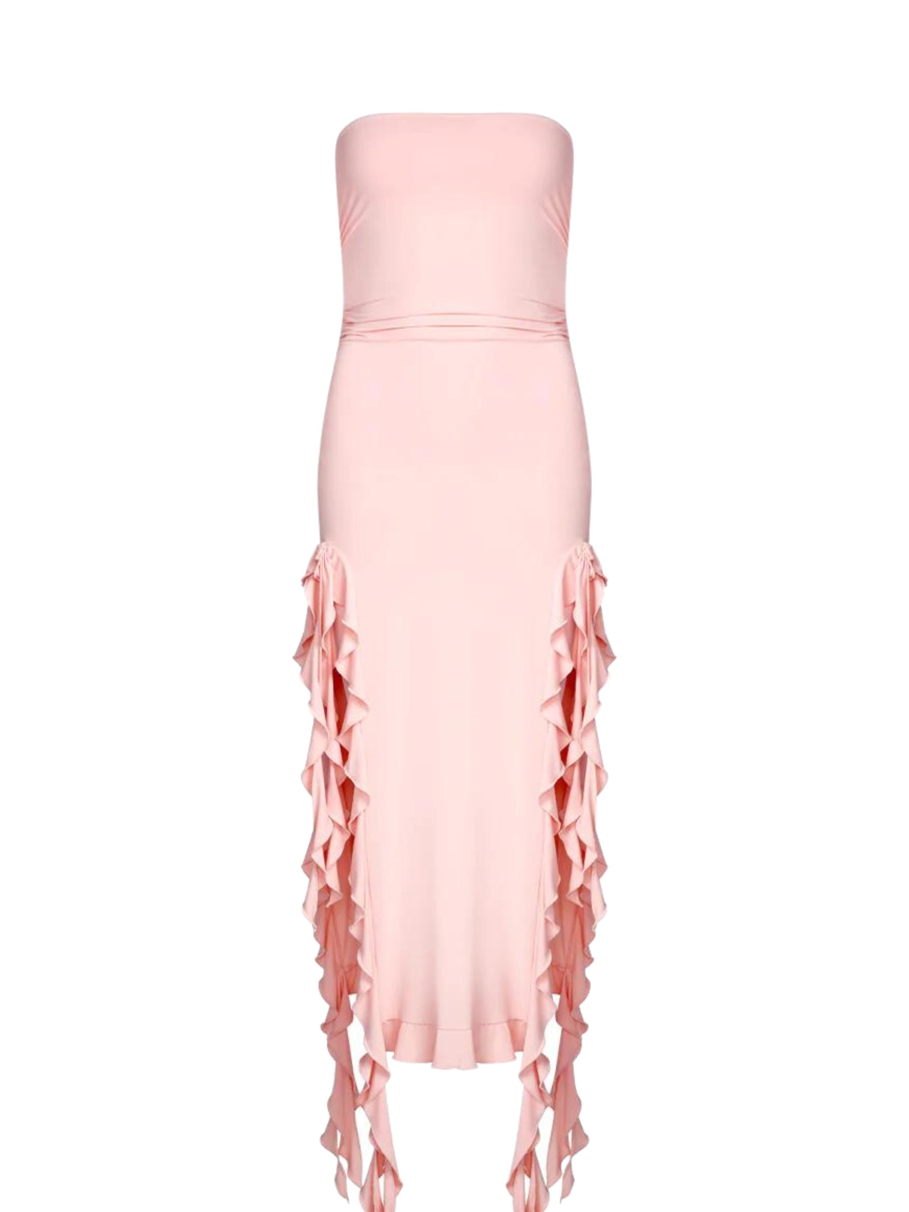 Laugh it up in the Lisa Strapless Ruffle Dress in Pink! This elegant. fun. and stylish dress is perfect for a night out. featuring a strapless silhouette and ruffle asymmetric skirt. all crafted from a flattering bodycon fit. Get ready for date night with Aesvs!